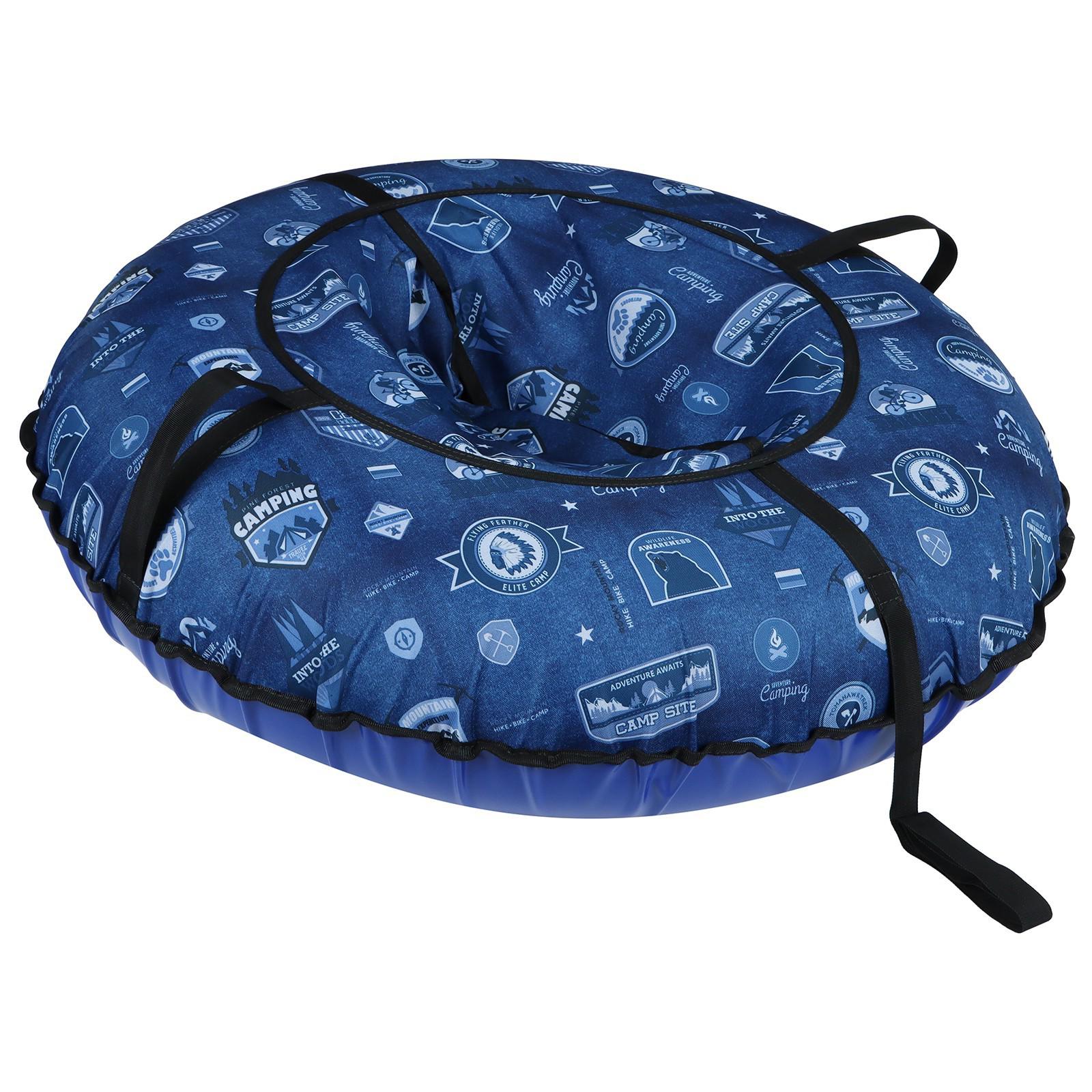 Дно тюбинга изготовлено из тентовой ткани 600-700 г/², что гарантирует долгий срок службы и обеспечивает отличное скольжение. Тюбинг оснащён безопасными ручками и молнией для быстрого доступа к камере. Имеет закрытую сердцевину, что исключает попадание снега внутрь. Фактический размер накачанного тюбинга зависит от температуры внешней среды и давления в камере. Для тюбинга подойдёт камера 16 дюймов. Предназначен для детей от 3 лет.