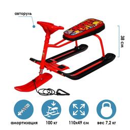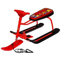 Снегокат предназначен для перевозки детей по плотному снегу или льду, катанию с горок. Имеет сварную конструкцию из стальных труб, пластиковых элементов и мягкое сиденье, обтянутое искусственной кожей с рисунком. Оснащён буксировочным и системой амортизации, которая обеспечивает комфортную поездку по крутым горкам и неровным поверхностям. Усиленный тормоз эффективен на обледенелой поверхности.