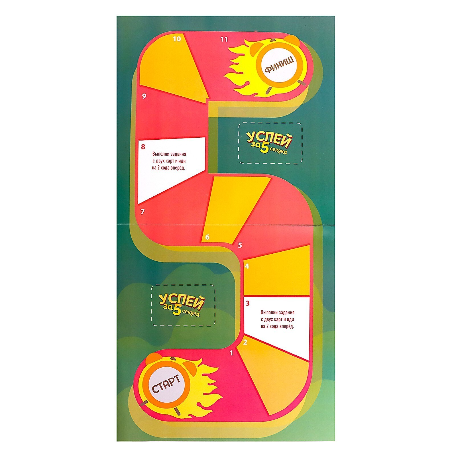 Разложите игровое поле, поставьте фишки на клетку «Старт». Первый из игроков переворачивает таймер с шариками. За это время, а это ровно 5 секунд, нужно дать ответ на вопрос или выполнить весёлое задание с карточки. Победит тот, кто первым дойдёт до финиша. Весёлой игры!