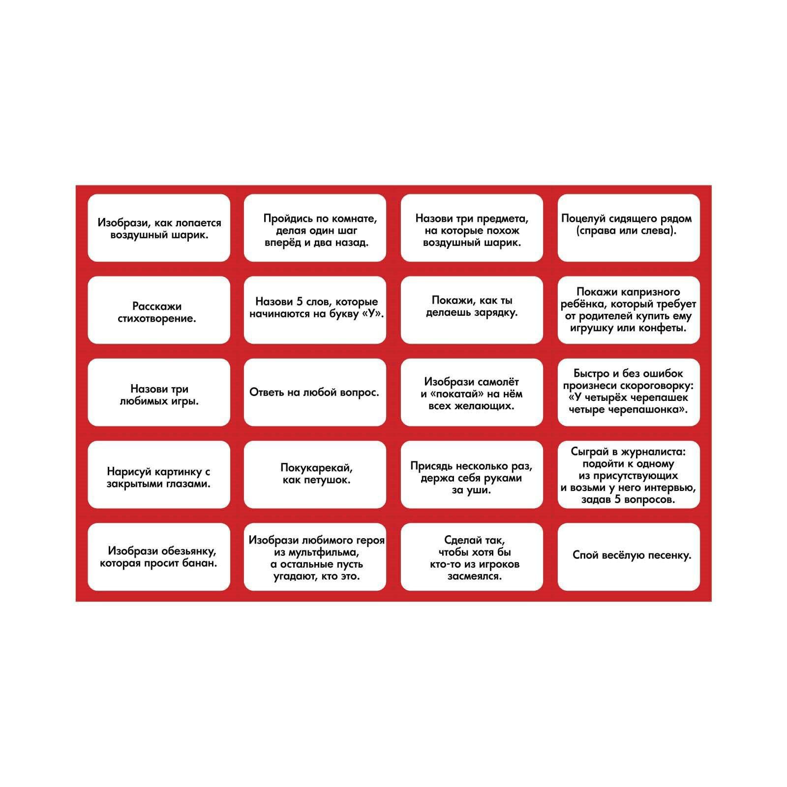 Участник, у которого упало яйцо, вытягивает карточку и выполняет написанное на ней задание, например поёт песню или без ошибок произносит скороговорку.