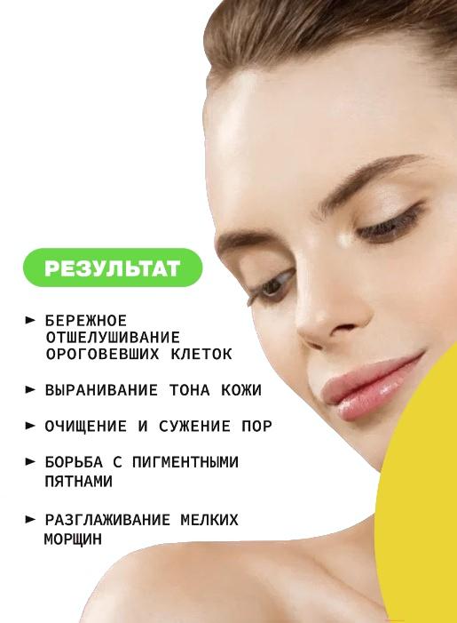 • Действие очищающее, отшелушивающее, сужение пор, выравнивание тона, от черных точек, антивозрастной уход, разглаживающее, тонизирующее, регенерирующее, от пигментных пятен, выравнивание рельефа, омолаживающее