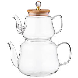 Набор для чаепития из 2-х оригинальных стильных чайников, который выдерживает высокую температуру кипящей воды.: нижний чайник объемом 1,5 л используется для кипятка, верхний чайник объемом 630 мл используется как заварочный. В таком наборе заваривание чая или трав особенное, так как происходит процесс настаивания на паровой бане, что позволяет плавно раскрывать и сохранять всю ценность напитка. Изделия выполнены из экологически чистого жаропрочного стекла и подходят для использования на стеклокерамической, электрической варочной поверхности, на газовых плитах необходимо дополнительно использовать рассекатель. Крышка имеет уплотнительное силиконовое кольцо, благодаря которому она надежно фиксируется на чайнике. Фильтр из нержавеющей стали в заварочном чайнике препятствует попаданию трав из чайника в чашку. Ручка имеет очень удобною форму для надежного захвата. Кноб на крышке в форме кристалла из акрила, благодаря бликам и сиянию создает неповторимую уютную, радостную атмосферу во время чаепития. Набор служит украшением стола и будет прекрасным подарком родным и близким.