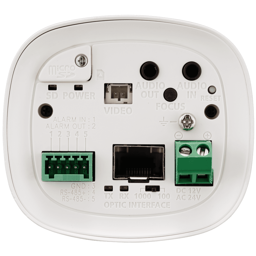 Сетевая камера видеонаблюдения с разрешением 1920×1080, CMOS-матрица 1/2.8", 0.1 лк, H.264, M-JPEG, волоконно-оптический SFP (двухволоконный разъем LC), видеовыход CVBS (тест), BLC, WDR 120 дБ, SSDR, SSNR III, DIS, AGC, режим коридора, «день/ночь», механический ИК-фильтр, встроенный микрофон, аппаратная аналитика, детекция звука, лиц и движения, RS-485, тревожный вход/выход, аудиовход/выход, слот для карт Micro SD/SDHC/SDXC до 64 Гбайт, многопотоковая передача, ONVIF, PoE, питание – AC 24 В ± 10 %, DC 12 В ± 10%, мощность – макс. 12.5 Вт.
