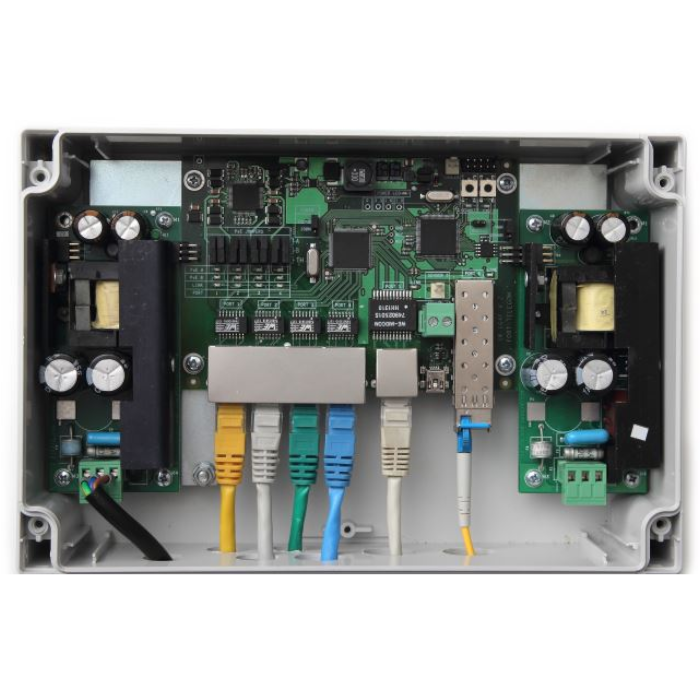 Управляемый коммутатор, GE SFP-слот, 4×FE-порта RJ-45 с PoE и Auto-MDIX, GE-порт RJ-45; матрица 4.8 Гбит/с, 9.63 Мбит/с, буфер пакетов 1 Мбит, таблица MAC 8К, MTU 1522 байт, управление потоком IEEE 802.3x, поддержка Passive PoE, бюджет РоЕ на порт — 15.4 + 15.4 Вт, общий бюджет РоЕ — 50 + 50 Вт, VLAN (802.1q), STP/RSTP, IGMP Snooping v2, QoS 802.1p, потребление — 120 Вт, ~220 В AC, гермовводы, грозозащита, IP66, -60 ºС…+50 ºС.