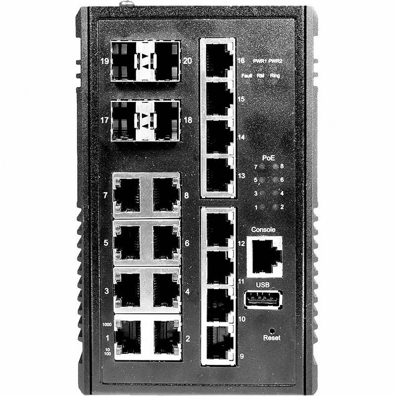 Промышленный управляемый (L2+) PoE коммутатор Gigabit Ethernet на 20 портов. Порты: 8 x GE (10/100/1000Base-T) с PoE (до 30W) + 8 x GE (10/100/1000Base-T) + 4 x GE (SFP 1000Base-X). Вход для резервного питания и тревожный выход. Уровень управления L2 (Web smart). Соответствует стандартам PoE IEEE 802.3af/at. Автоматическое определение и режим антизависания PoE устройств, управление питанием. Суммарная мощность PoE до 240W. Питание DC45-57V(макс. 263W). БП в комплект НЕ входит. Размеры (ШхВхГ): 93x145x118мм. Монтаж на DIN-рейку. Рабочая температура: -40…+75°С.