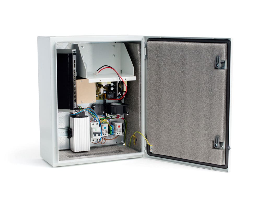 8 FE RJ-45 с PoE, GE Uplink, SFP Бюджет РоЕ 120 Вт Режим VLAN до 250 м Встроенный ИБП IP65, IK10, –45 ºC... +50 ºC