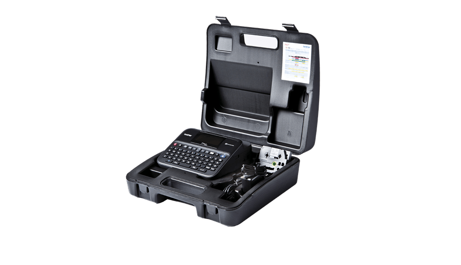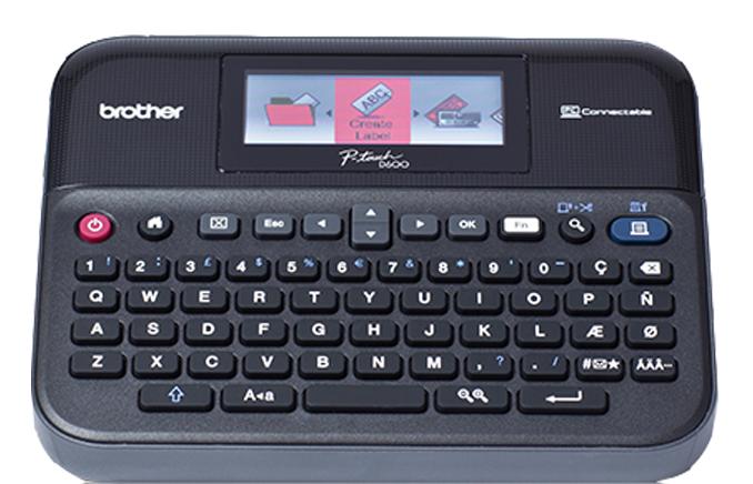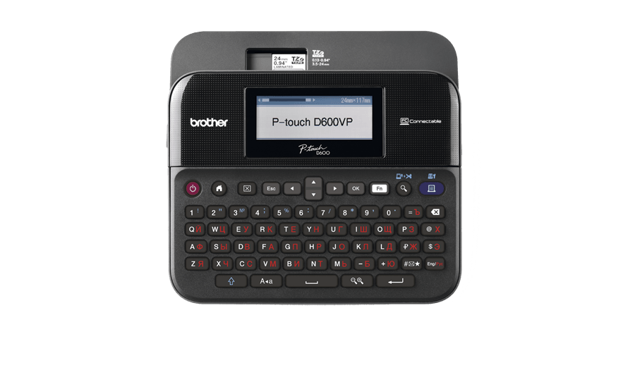Принтер наклеек Brother PT-D600, ленты TZE до 24 мм, кол-во строк любое, 30 мм/сек, автонож, печать ШК,дисплей, USB, блок питания, кейс
