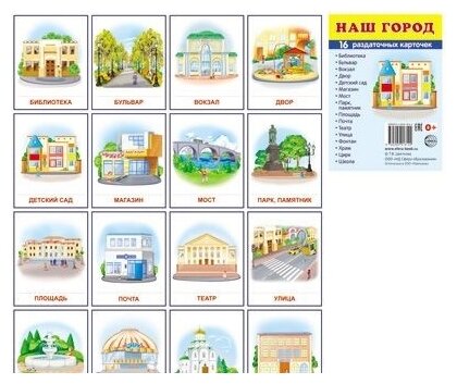 - Аннотация 16 раздаточных карточек размером 63х87 мм для познавательного и речевого развития. На обороте каждой карточки - название здания на русском и английском языках.