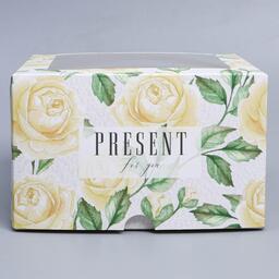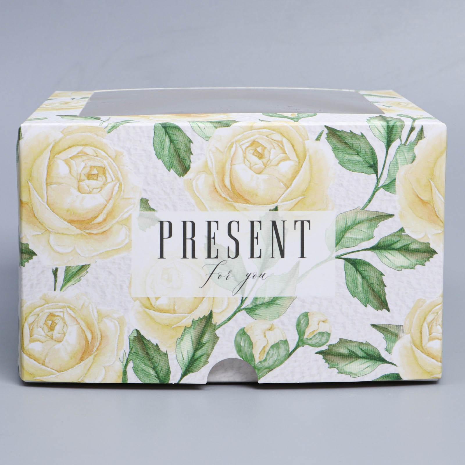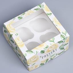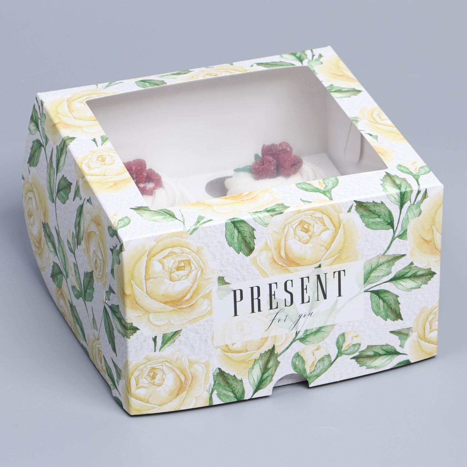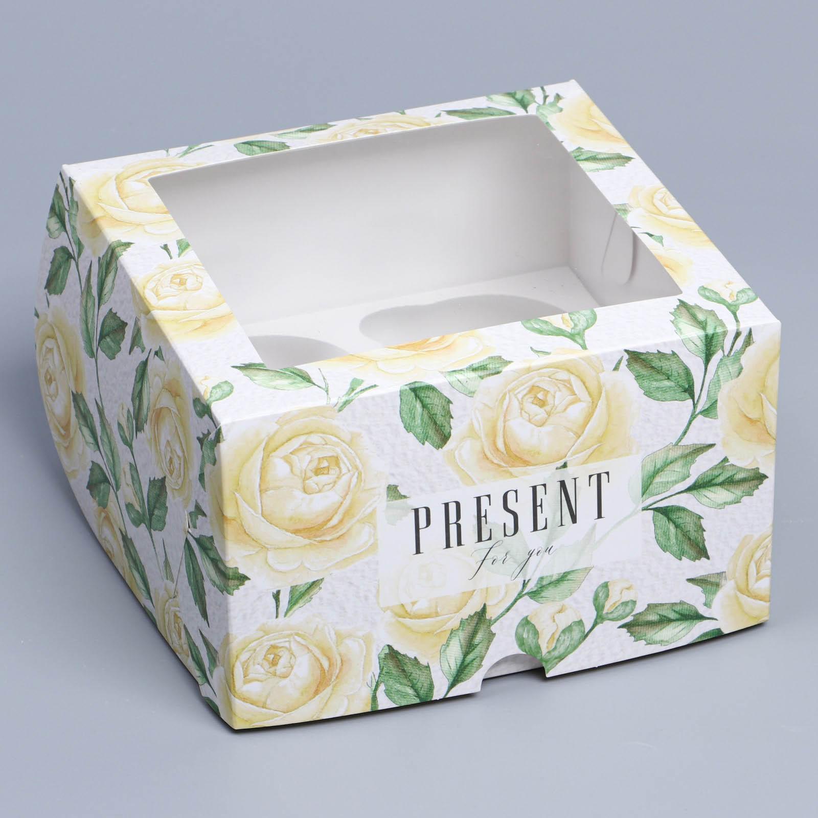 Коробка складная на 4 капкейка с окном «Белые розы», 16 х 16 х 10 см 9086092
