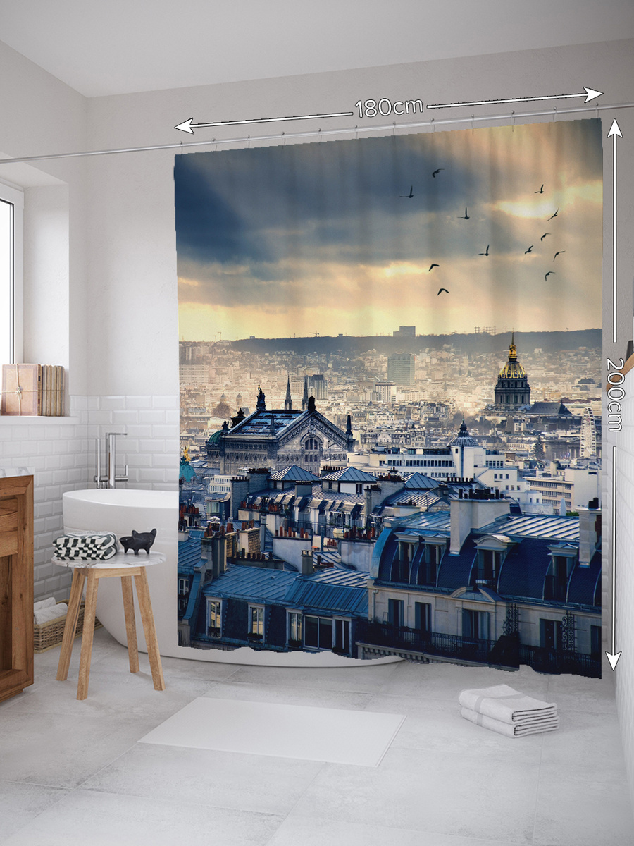 Штора (занавеска) для ванной "По городским крышам" из ткани, 180х200 см с крючками