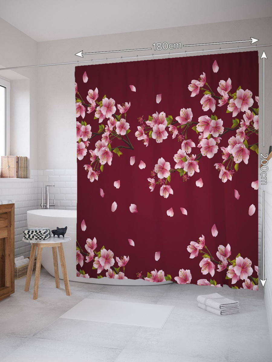 Штора (занавеска) для ванной "Цветки сакуры" из ткани, 180х200 см с крючками
