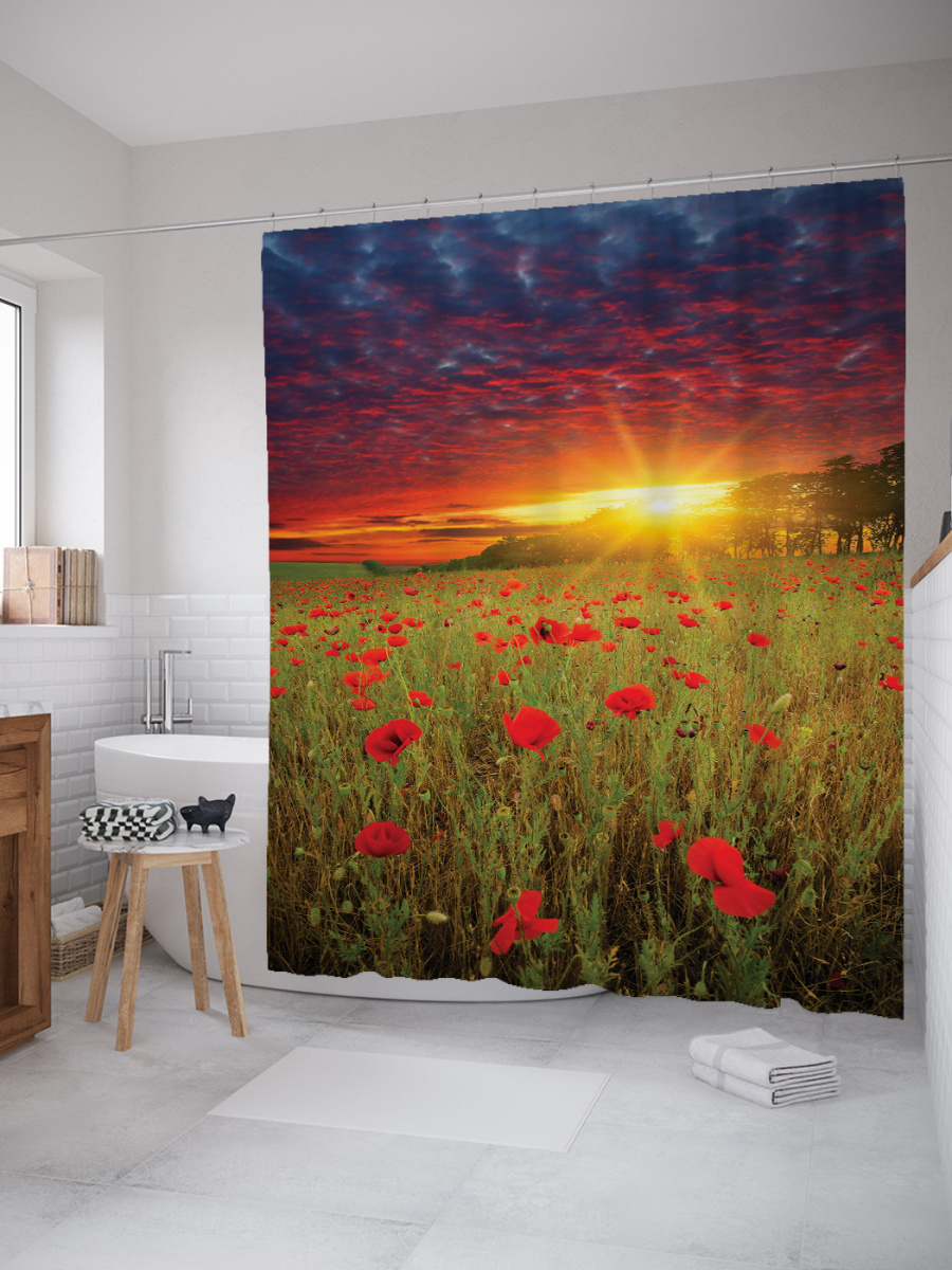 Штора (занавеска) для ванной "Маки на закате" из ткани, 180х200 см с крючками
