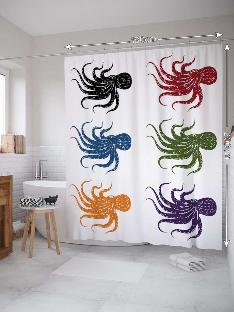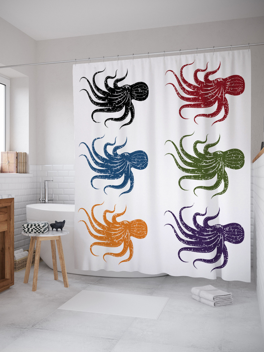 Штора (занавеска) для ванной "Радужные кальмары" из ткани, 180х200 см с крючками