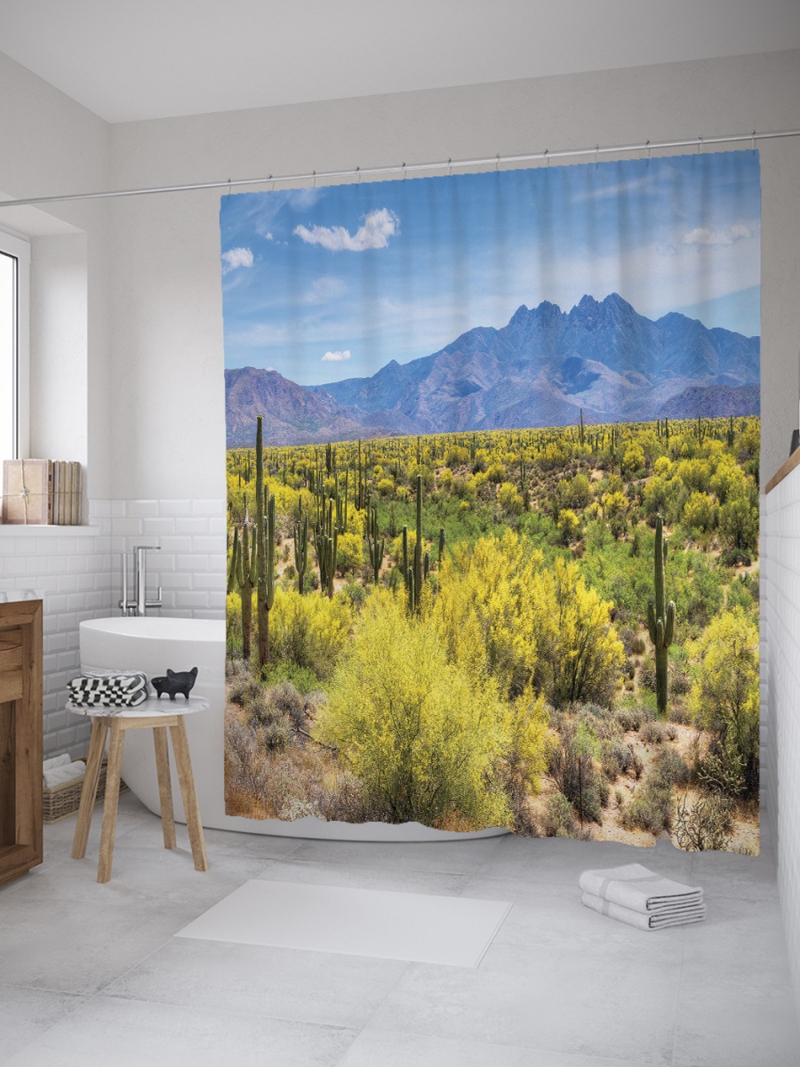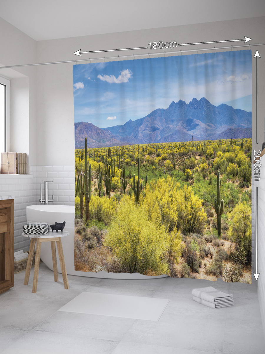 Штора (занавеска) для ванной "Дикие кактусы" из ткани, 180х200 см с крючками