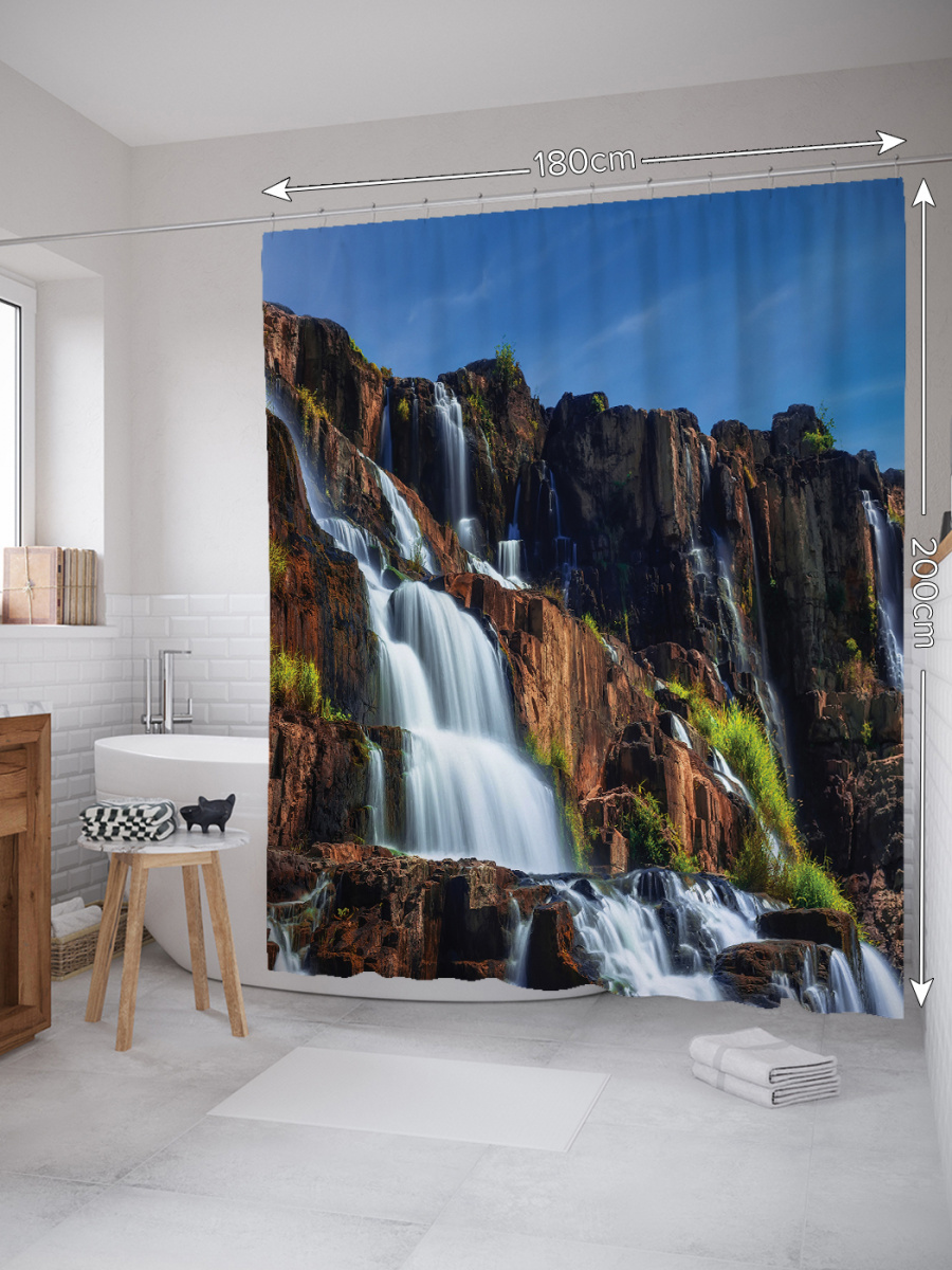 Штора (занавеска) для ванной "Водопад с небесных гор" из ткани, 180х200 см с крючками