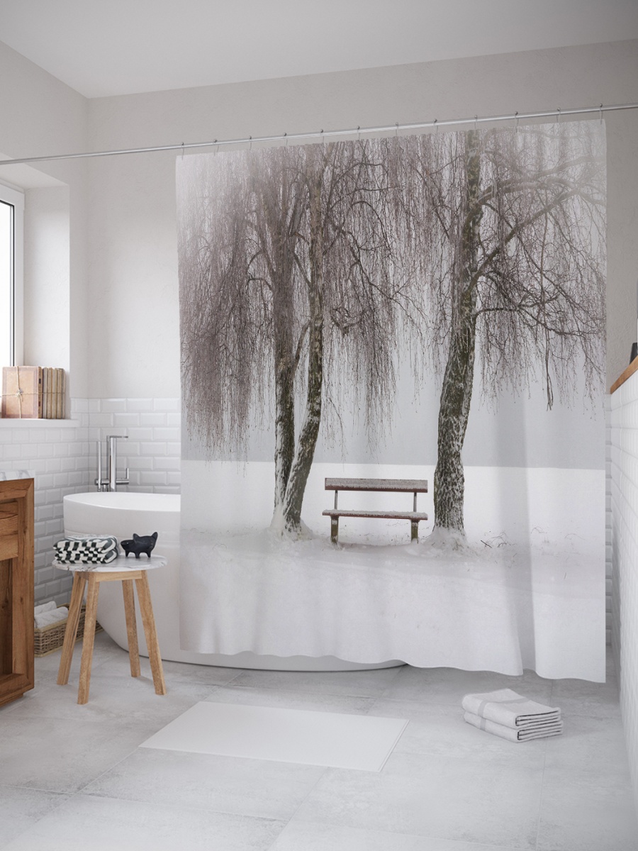 Штора (занавеска) для ванной "Тишина между деревьев" из ткани, 180х200 см с крючками