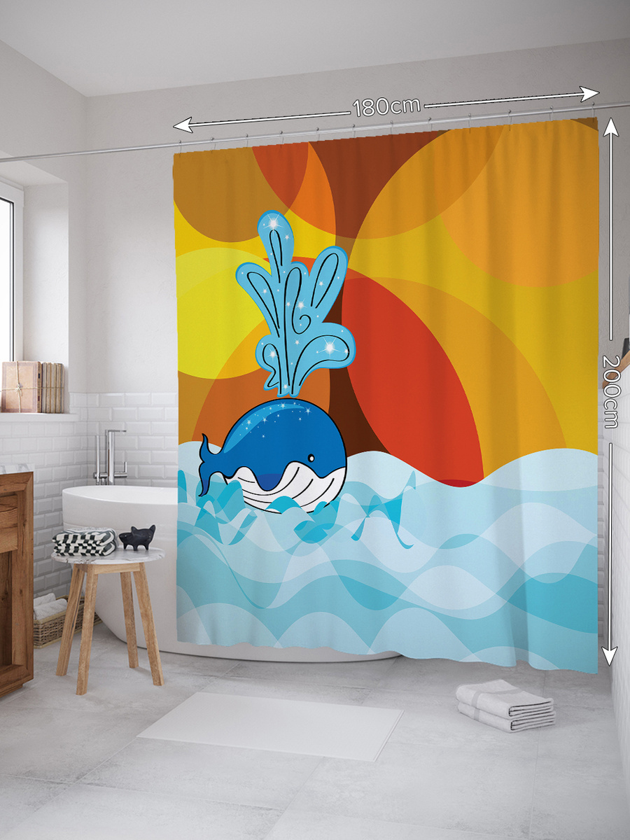 Штора (занавеска) для ванной "Кит в красках" из ткани, 180х200 см с крючками