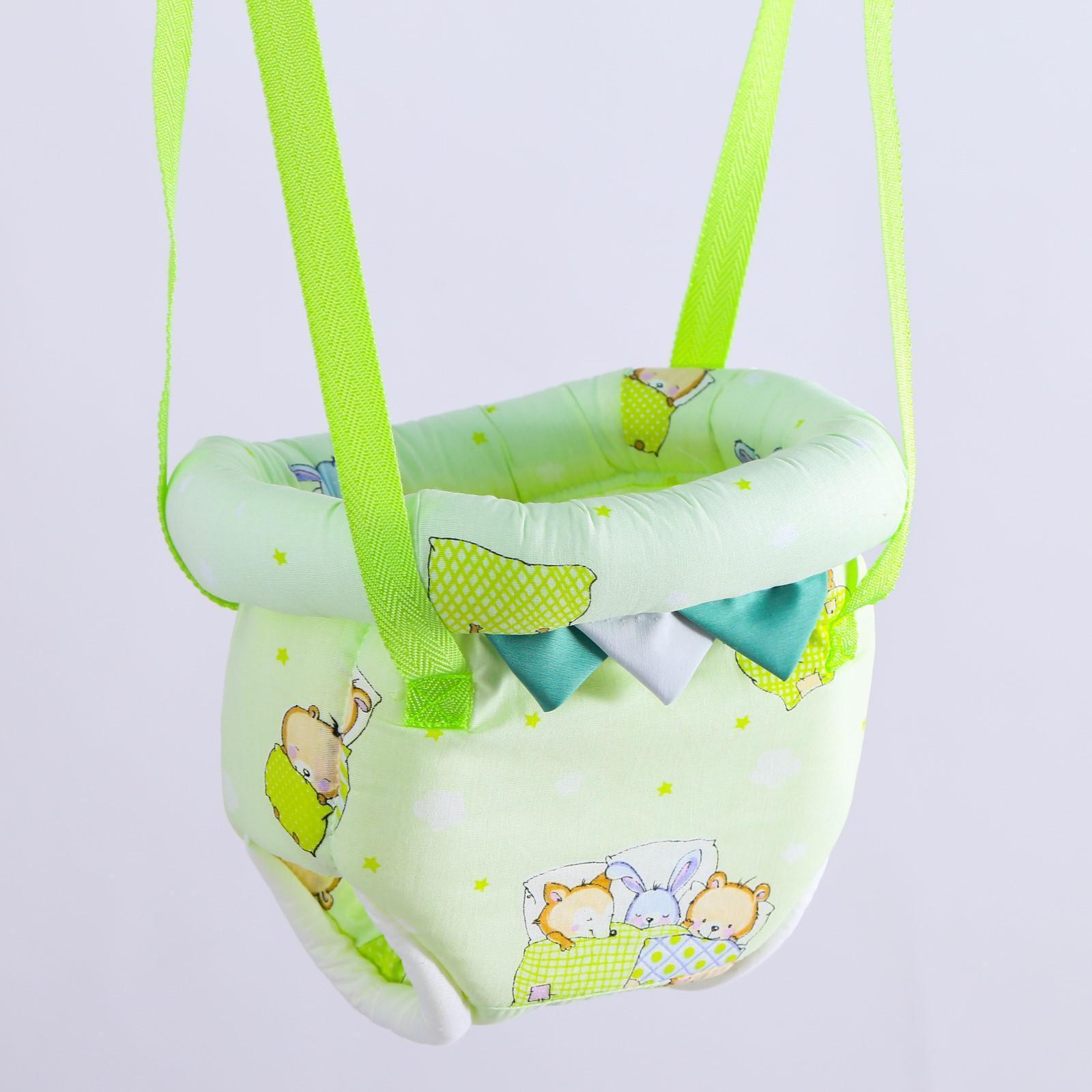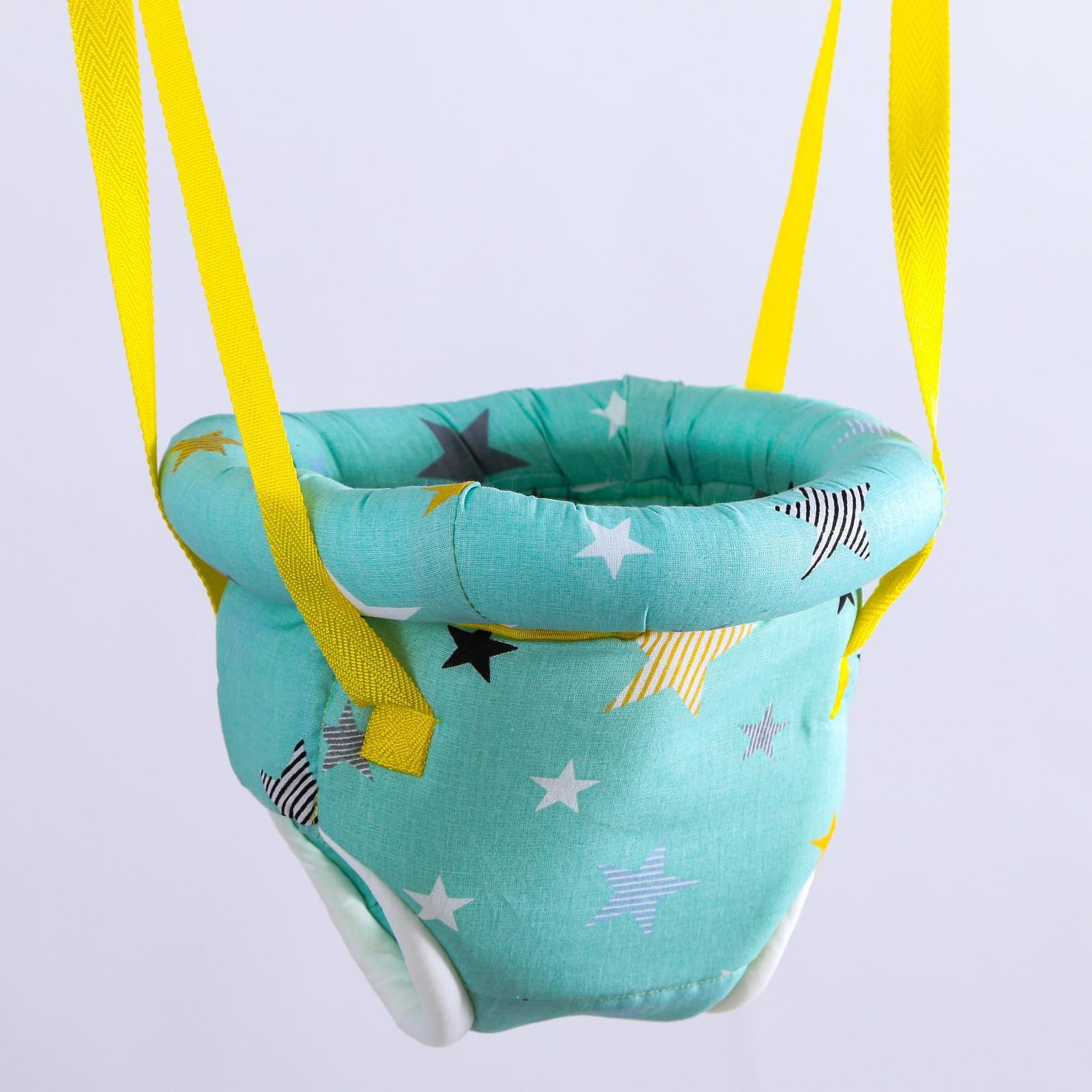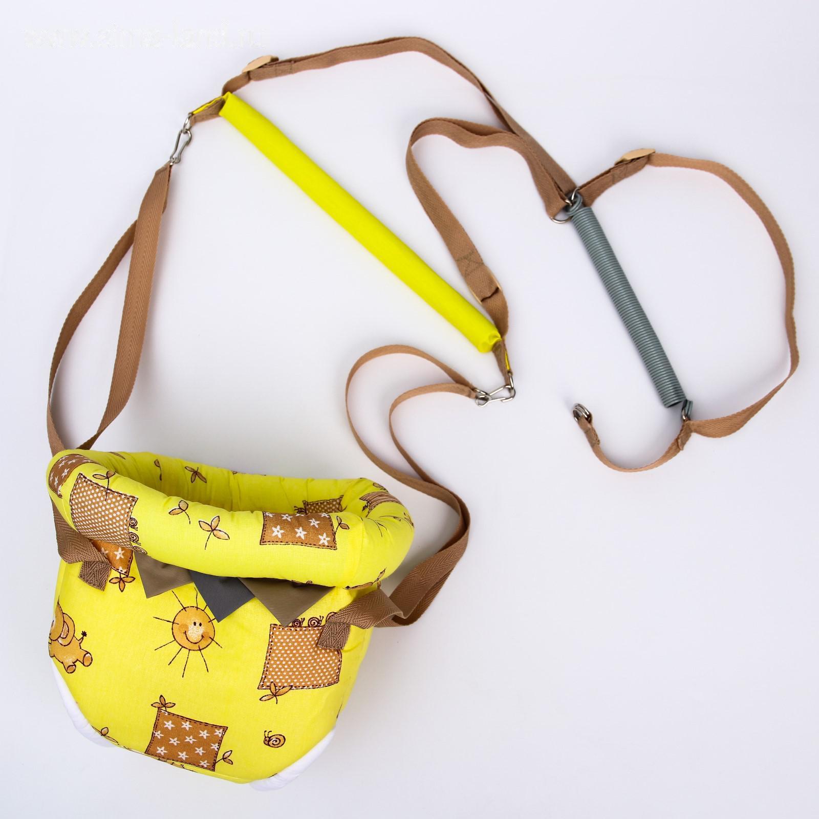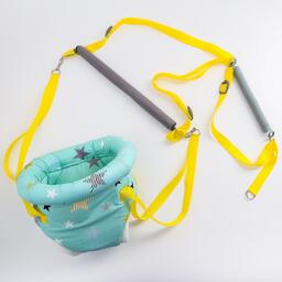Тренажёр 3 в 1 представляет собой набор из качелей, тарзанки и прыгунков. Полугодовалого кроху посадите в сиденье-штанишки. Малышу понравится активная игра, он будет подпрыгивать и качаться. Для деток постарше можно использовать только перекладину в качестве тарзанки.