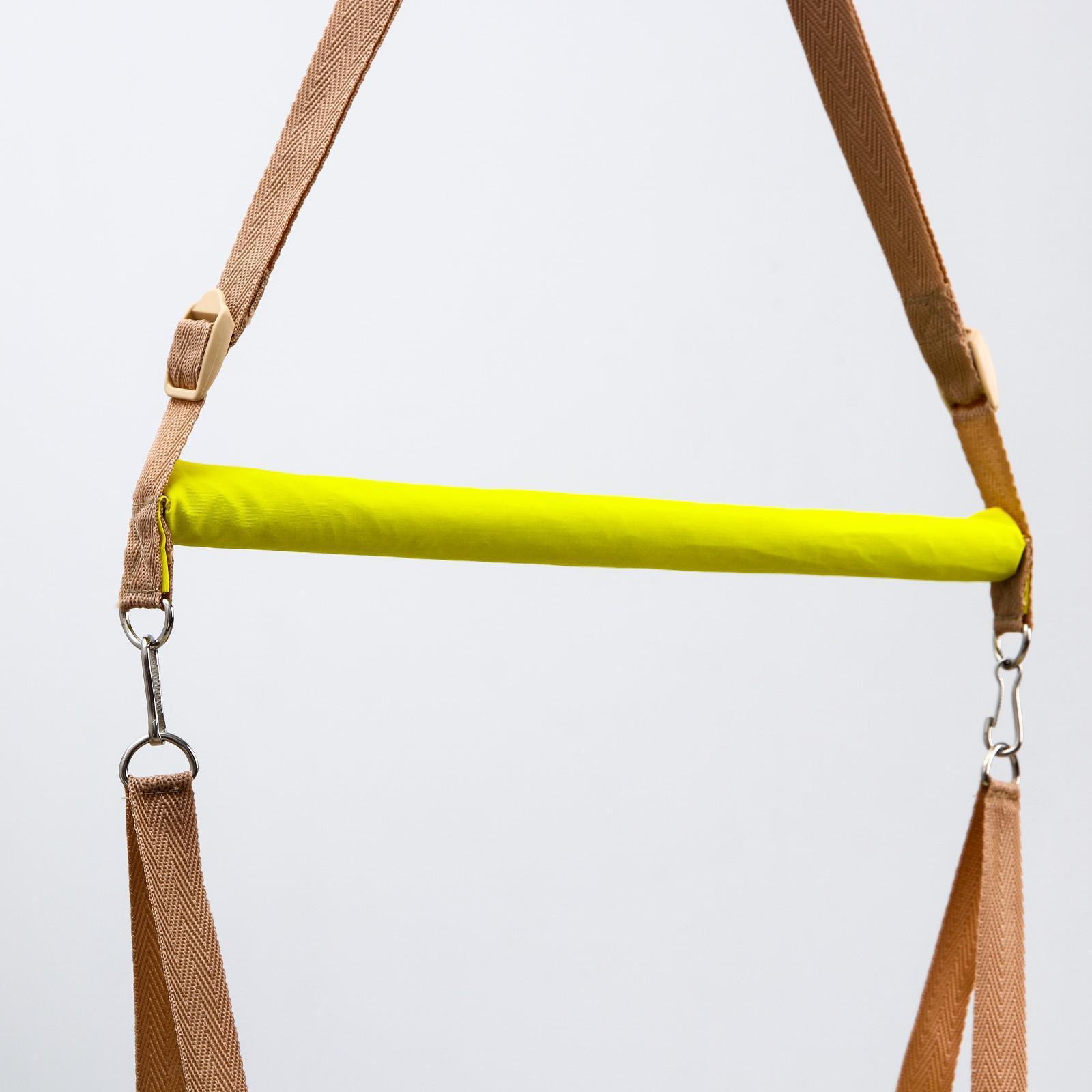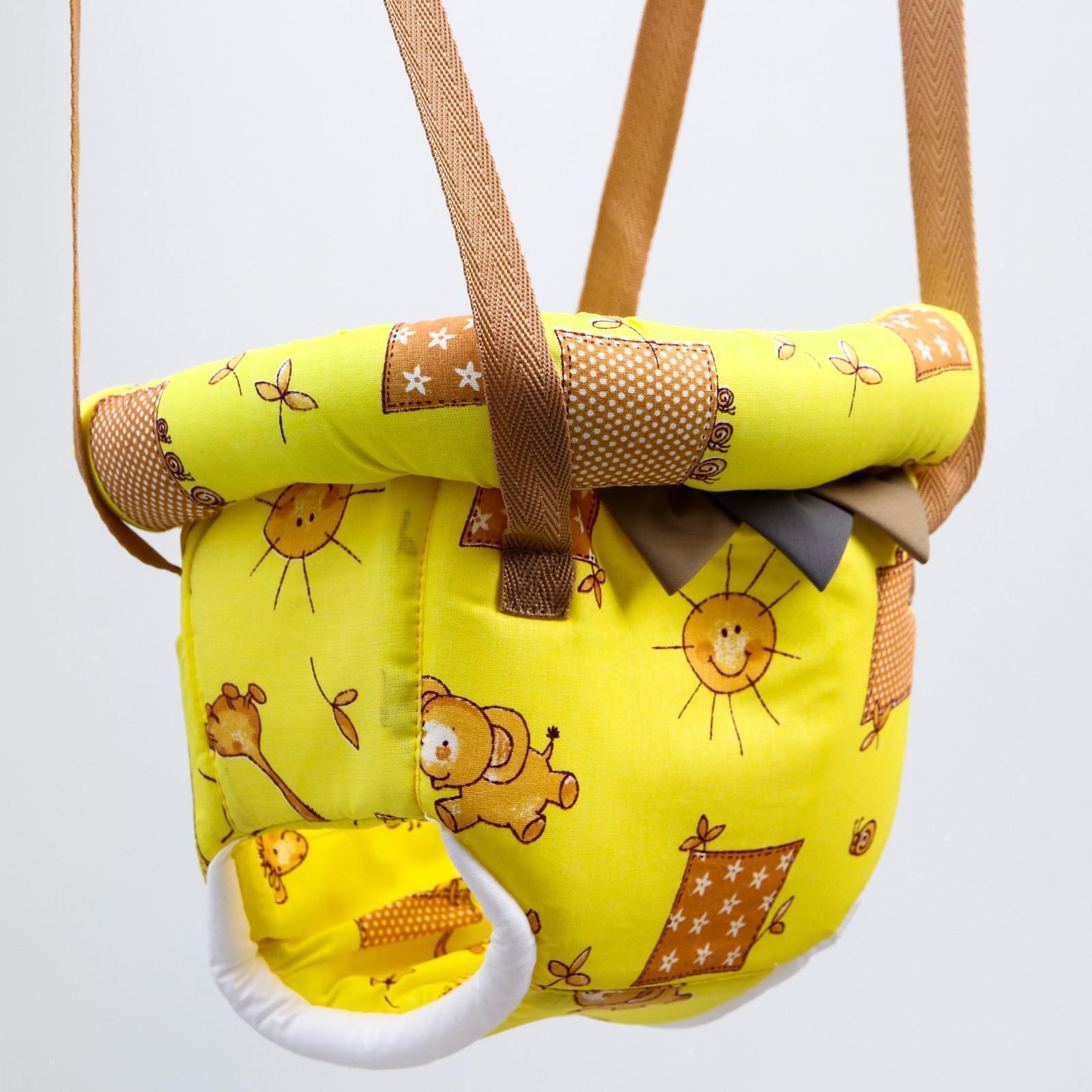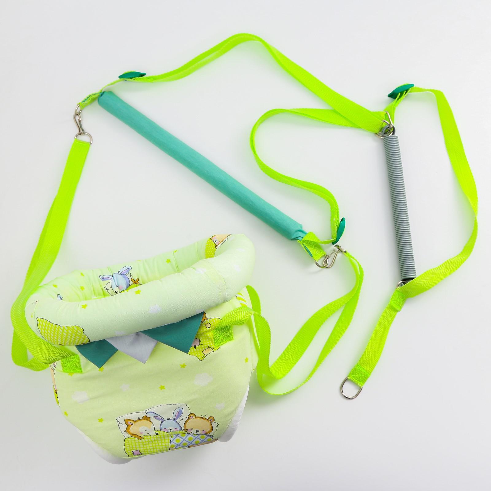 Тренажёр 3 в 1 представляет собой набор из качелей, тарзанки и прыгунков. Полугодовалого кроху посадите в сиденье-штанишки. Малышу понравится активная игра, он будет подпрыгивать и качаться. Для деток постарше можно использовать только перекладину в качестве тарзанки.