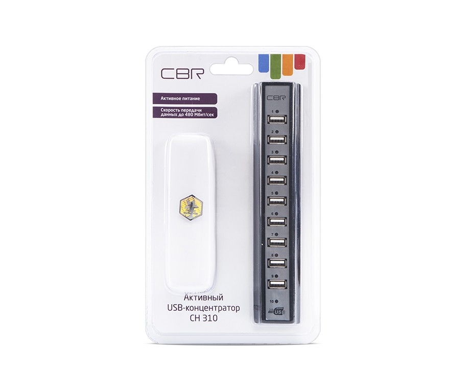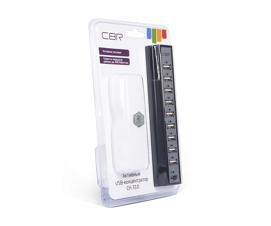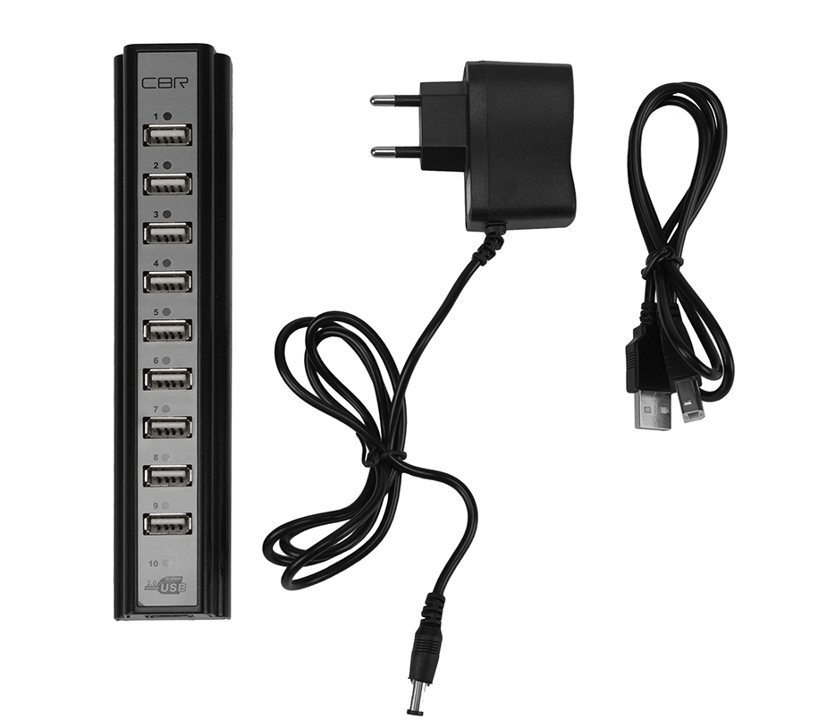 CBR USB Hub CH 310 - это десятипортовый высокоскоростной USB-концентратор, который позволяет наиболее быстро и удобно подключить к компьютеру или ноутбуку внешнее оборудование USB. Эта модель USB-концентратора позволяет одновременно использовать большое количество энергоемких устройств, благодаря питанию от компьютера и сети. Десять USB-портов увеличат возможности подключения к компьютеру разнообразных устройств, с этой моделью все устройства смогут работать одновременно с отличной скоростью. CH 310 решит все проблемы в подключении USB-устройств к ПК и у Вас всегда найдется свободный USB-порт для друзей.