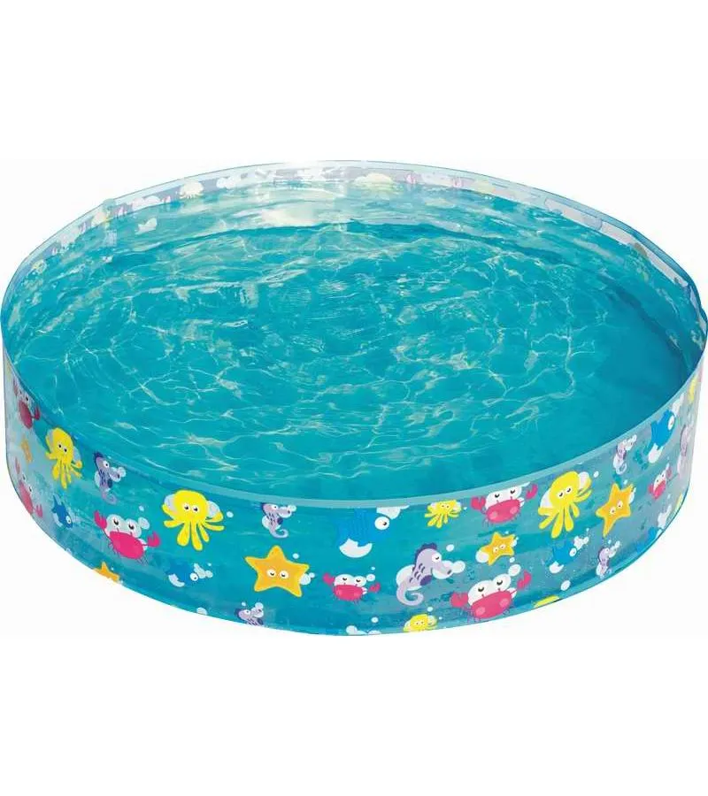 Детский бассейн имеет каркасный бортик с рисунком на морскую тему и предназначен для купания детей от трех лет. Бассейн легко собирается и занимает мало места, что позволяет располагать его на небольшом участке.