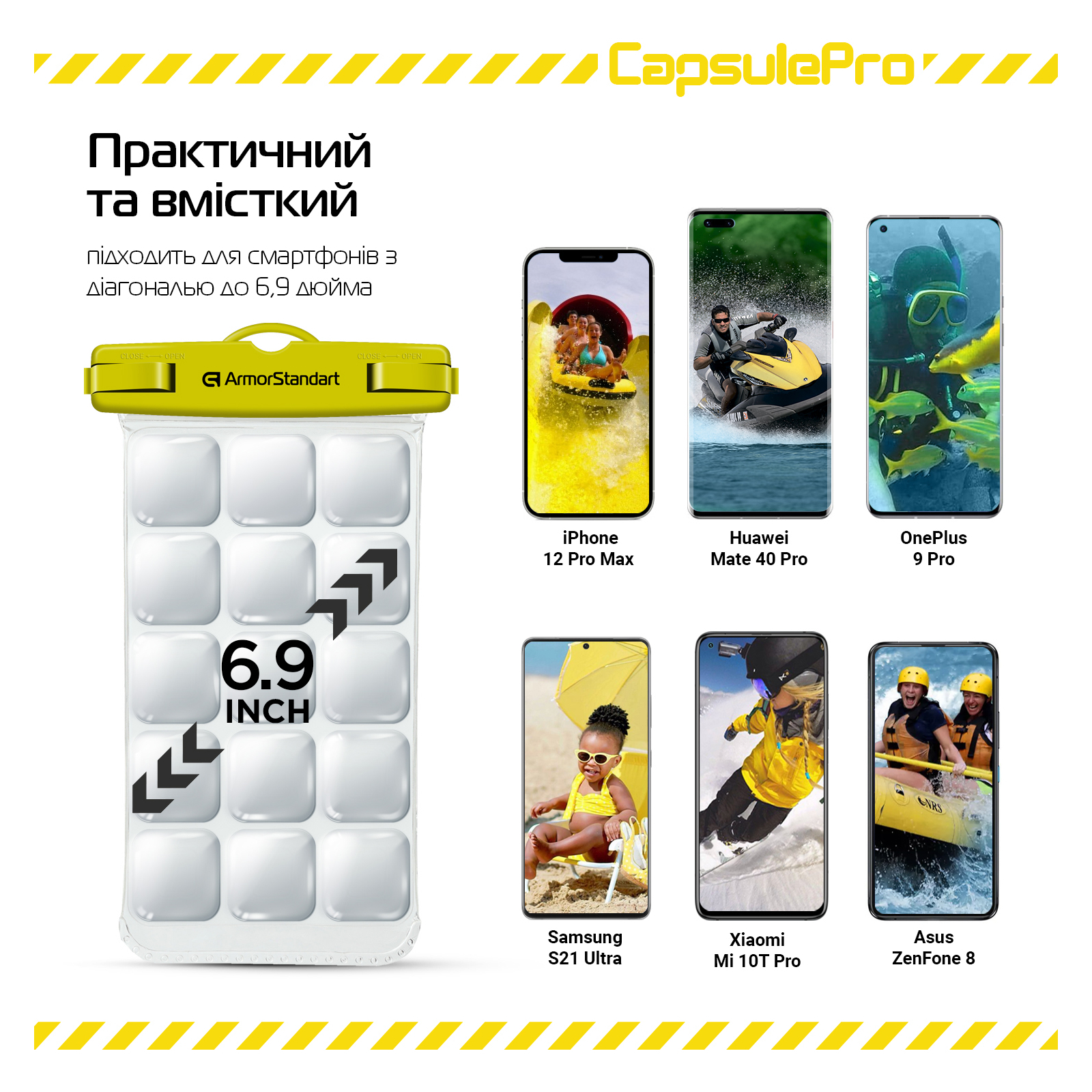 CapsulePro Waterproof Floating Case — досить місткий, що робить його універсальним для всіх типів смартфонів із діагоналлю до 6.9 дюймів. Також чохол не тільки захистить ваш пристрій, а й ключі, гроші, документи або інші важливі дрібні речі.