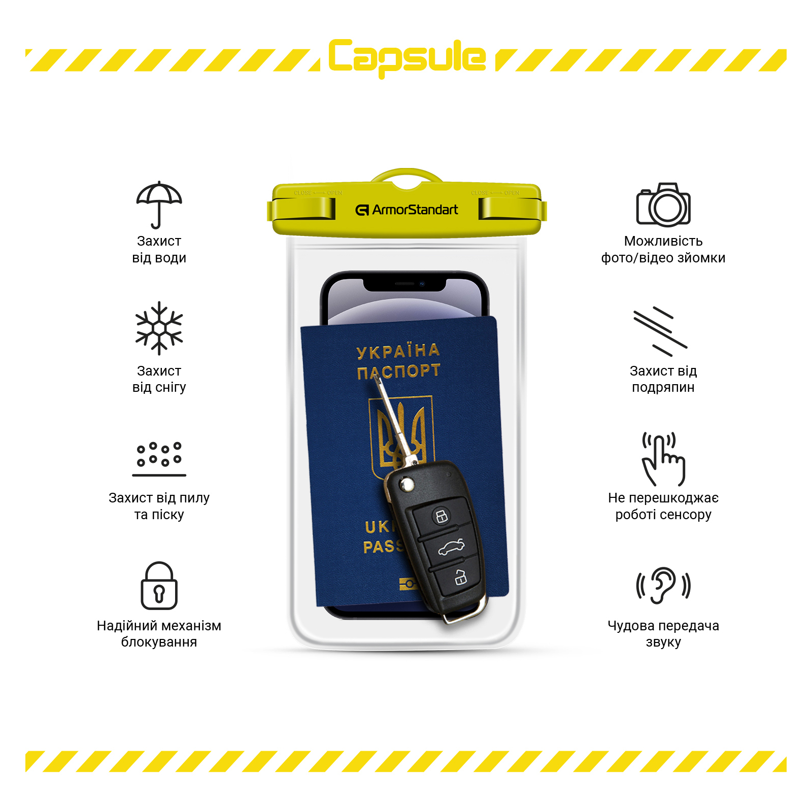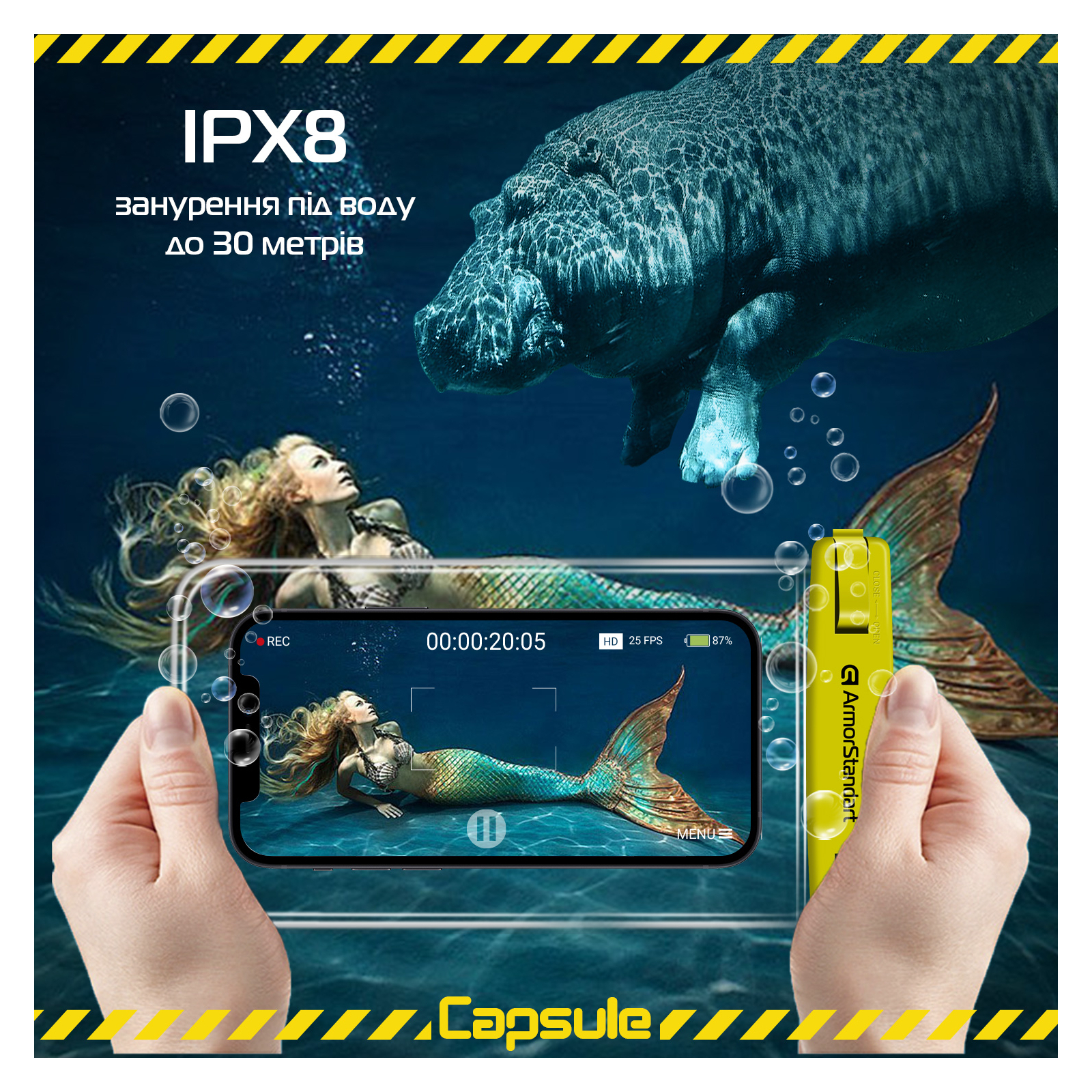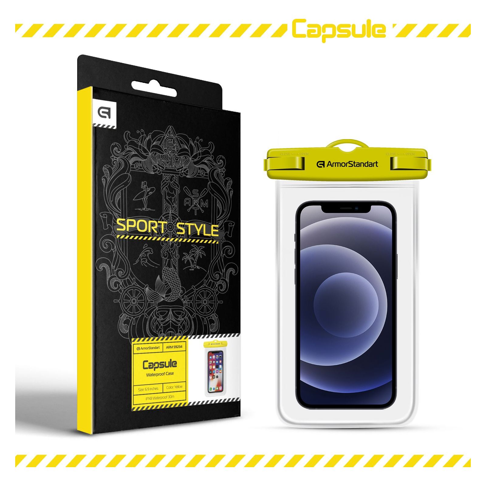 Водонепроникний чохол ArmorStandart Capsule Waterproof Case чудово захистить смартфон під час занять екстремальними видами спорту, а також на активному відпочинку, на пляжі або воді.