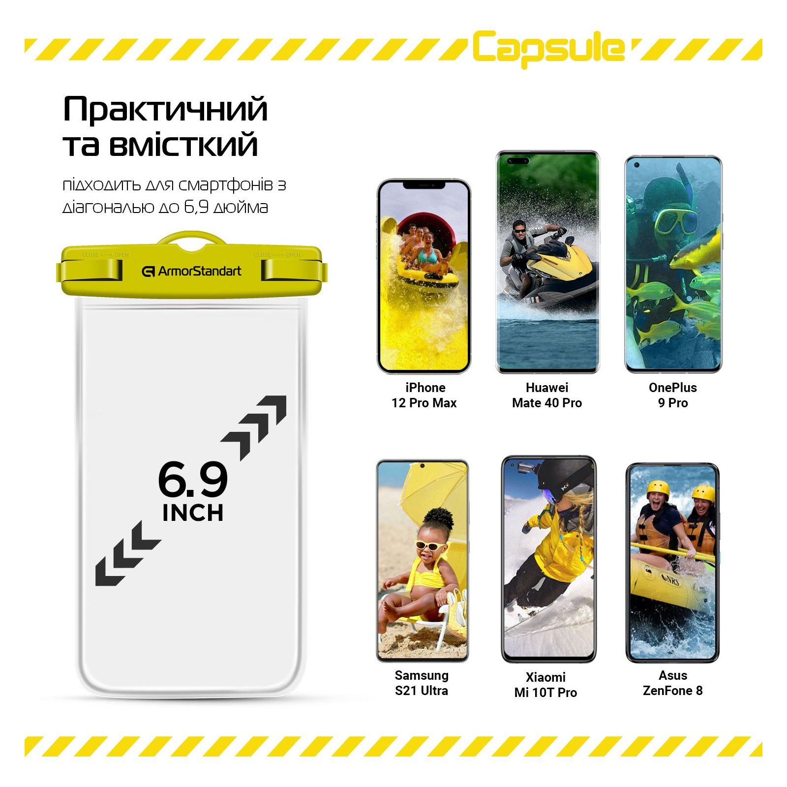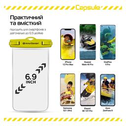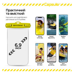 Capsule Waterproof Case — досить місткий, що робить його універсальним для всіх типів смартфонів із діагоналлю до 6.9 дюймів. Також чохол не тільки захистить ваш пристрій, а й ключі, гроші, документи або інші важливі дрібні речі.