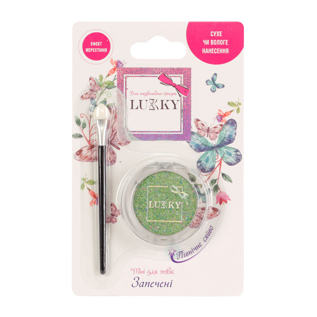 Запечені тіні для повік "Північне сяйво" від Lukky дадуть змогу дівчинці перевтілитися для свята або виступу лише за 5 хв! У тіней ніжне салатове мерехтіння й перламутровий блиск. Такими тінями легко зробити чарівний акцент на повіках, і образ засяє новими барвами! Ніжні й стійкі, вони навіть у разі нанесення в один шар створюють насичене кольором покриття, не скочується і має акуратний вигляд упродовж усього дня. У комплекті йде аплікатор. Тіні можна наносити сухими або вологими, для створення відтінків різної насиченості. А ще — тіні дуже економні, їх вистачить дуже надовго. У складі використані безпечні гіпоалергенні компоненти. Змиваються тіні звичайною водою з милом.