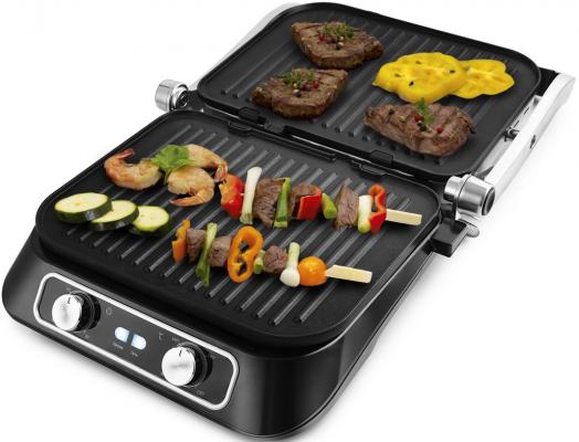Прочие особенности и свойстваНапряжение: 220-240 В, 50/60 Гц Мощность: 1800-2100 Вт Ёмкость поддона для жира: 100 мл Класс защиты от поражения электрическим током: I класс Длина шнура: 0,94 м Таймер: 30 мин Комплектация: Электрогриль - 1 шт Съёмные панели - 2 шт Руководство по эксплуатации - 1 шт Гарантийный талон - 1 шт Конструкция гриля позволяет готовить в двух режимах. В двухстороннем режиме гриль закрывается крышкой, и продукты готовятся одновременно с двух сторон. В одностороннем режиме крышка гриля откидывается на 180 °С, и гриль превращается в большую жаровню.