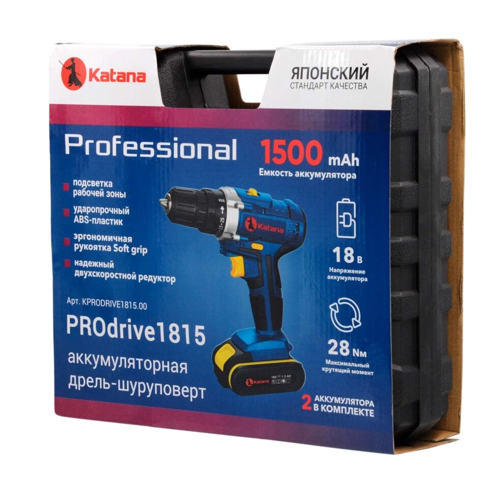 Аккумуляторная дрель-шуруповерт KATANA PROdrive 1815 (18В, 2 акк, 1,5 А/ч Li-ion, 2 ск, 19 Нм, кейс)