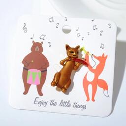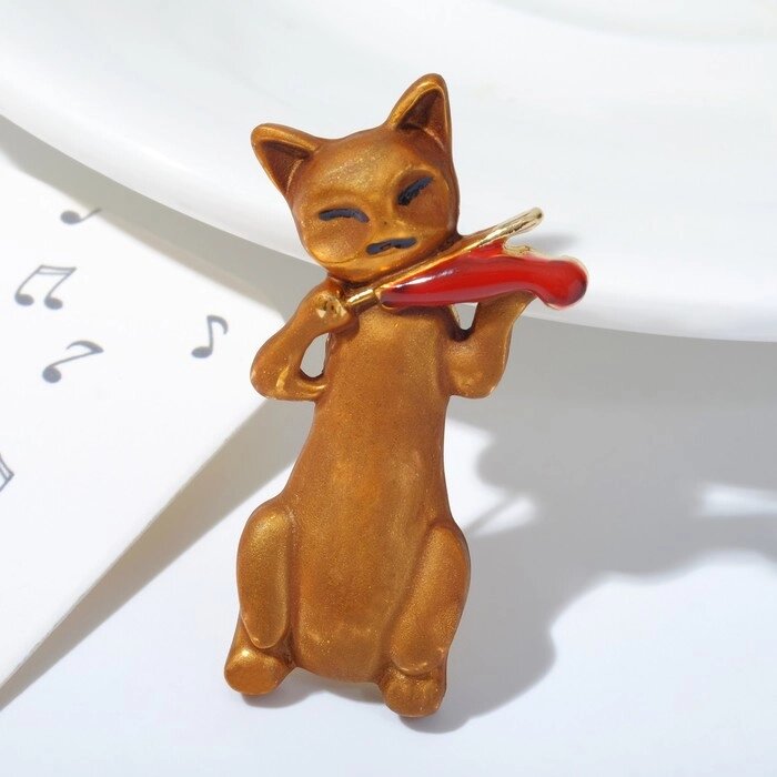 Брошь "Кот" играет на скрипке, цвет коричнево-красный в золоте