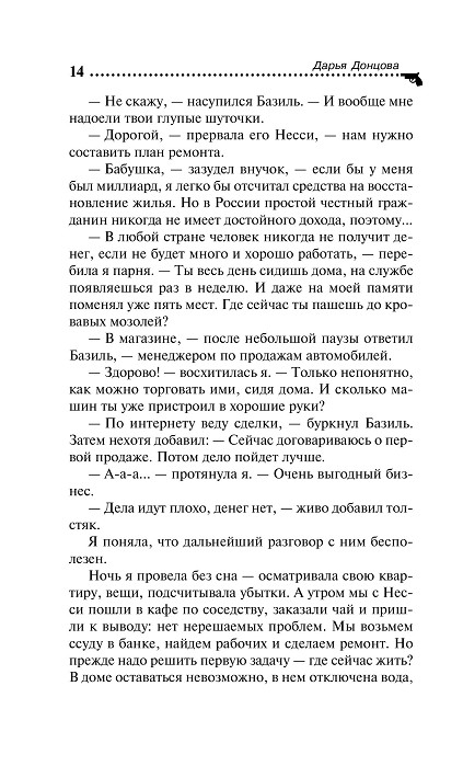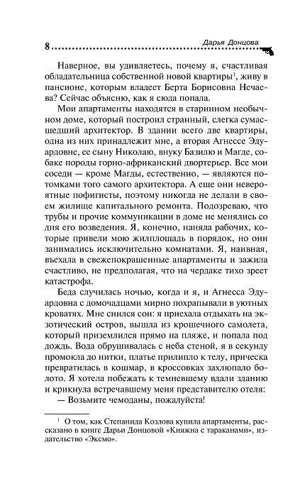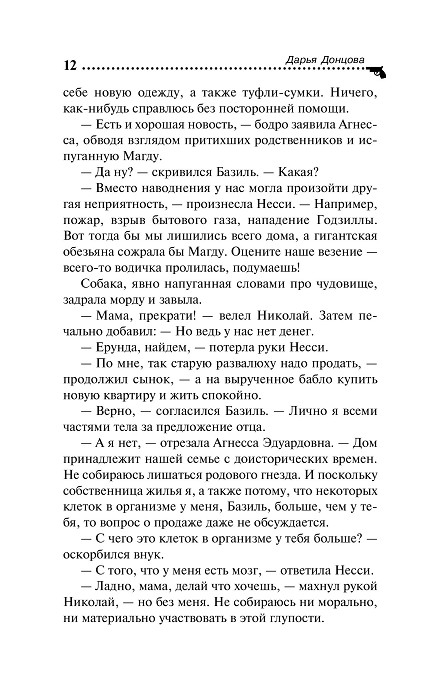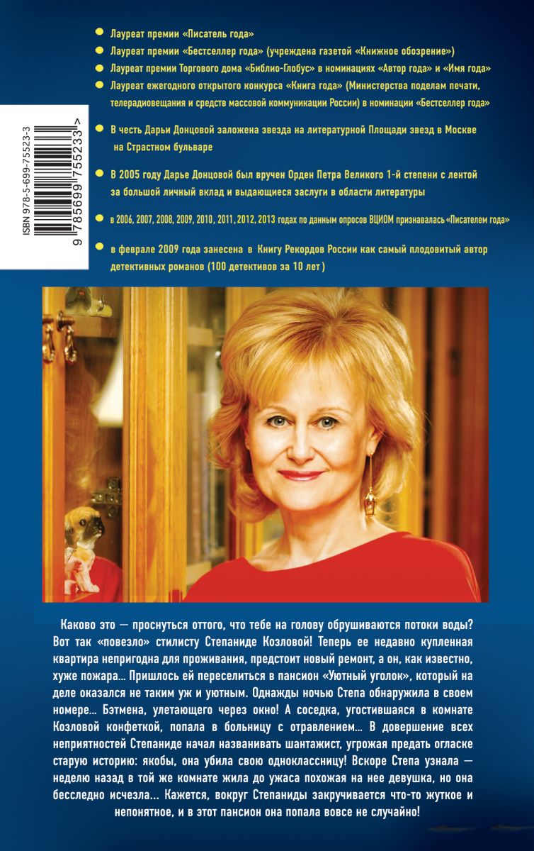 Комментарий:Дарья Донцова является народным автором на 100%. Общенациональное, повсеместное признание её творчества обусловлено метким попаданием в «десятку» литературных интересов и вкусов миллионов читателей. Персонажи её детективов, живые симпатичные люди с говорящими именами и фамилиями, распутывают хитросплетения таинственных преступлений, крепко привязывая внимание читателей. Ясное понимание психологии современника, естественный, легкий язык повествования, свободное воображение помогли Дарье Донцовой стать автором книг, вышедших астрономическим тиражом. Она лауреат многочисленных литературных премий и практически бессменный обладатель звания «Писатель года» по результатам опросов ВЦИОМ.