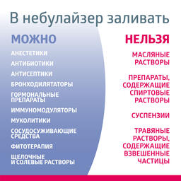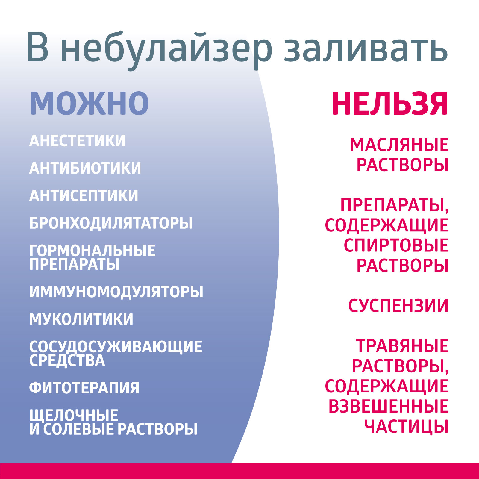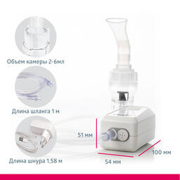 • Комплектация компрессор; распылитель; воздушный шланг; мундштук; насадка для носа; маска для взрослых; маска для детей; комплект фильтров; сетевой адаптер