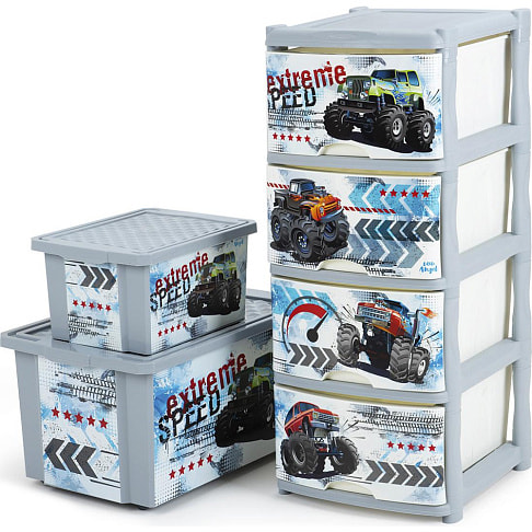 Коллекция для хранения Little Angel COOL Супер Трак - комплексное решение для наведения порядка в детской. Коллекция включает детские ящики 2х размеров -17 и 57 литров, которые устойчиво ставятся друг на друга, образуя систему хранения, и комод с 4 ящиками. Крышки ящиков надежно фиксируются, ящик 57 литров оснащен колесиками для легкого перемещения по комнате. Декор с внедорожными автомобилями станет отличным дополнением интерьера детской комнаты смелого мальчишки. Для производства детских товаров Little Angel используются исключительно безопасные нетоксичные материалы. Рисунок надежно вплавлен в поверхность и устойчив к воздействию воды и чистящих средств.