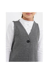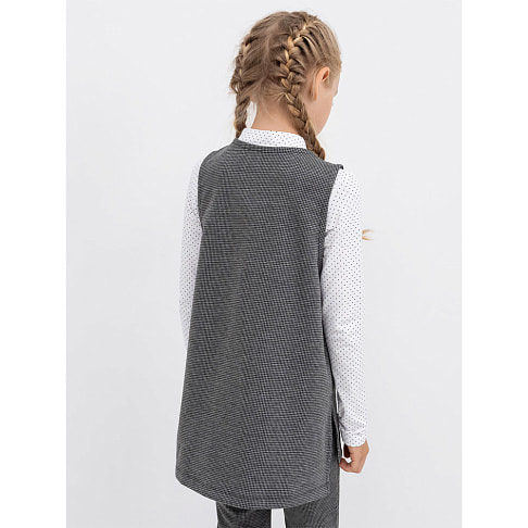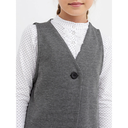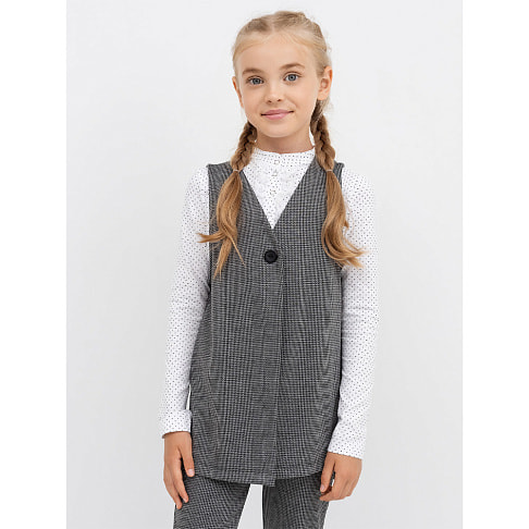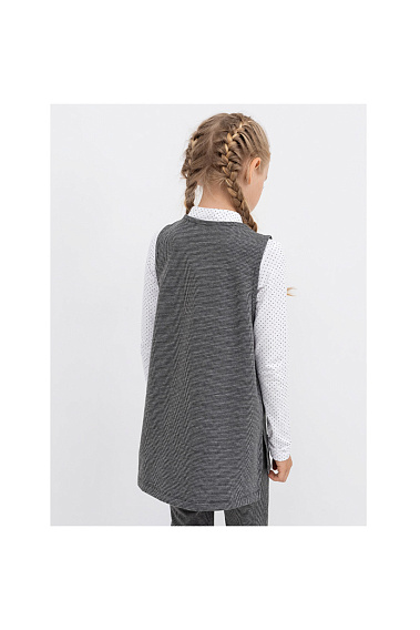 Жилетка прямого силуэта для девочки, выполненная из трикотажного полотна академик. Спинка без швов и рельефов. Спереди застегивается на пуговицу. Борт переда асимметричный. Вырез V-образной формы. Спинка длиннее переда. В боковых швах есть стильные разрезы. Рекомендуем!