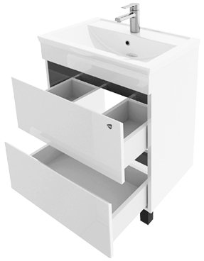 Компактная тумба под прямоугольный умывальник Бергамо 60 с отв. с двумя выдвижными ящиками. Каркас: ЛДСП окрашенное высокоглянцевой эмалью, фасад МДФ + 5-ти слойная покраска высоко-глянцевой эмалью, зеркальная вставка ленты HIPS. Фурнитура: направляющая скрытого монтажа с доводчиком BOYARD, в комплекте идут 2 квадратные алюминиевые ножки с креплением тумбы к стене.