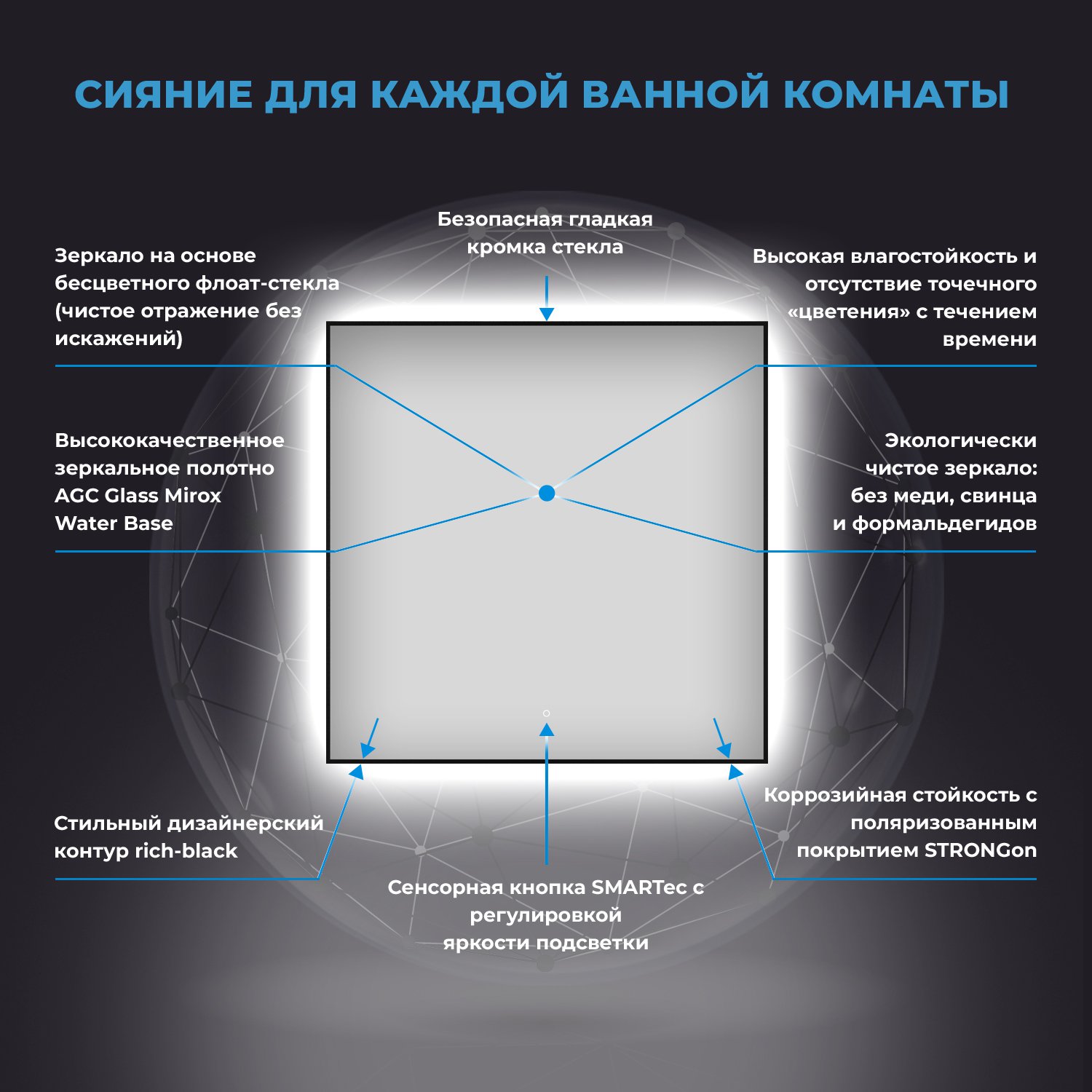 зеркало wellsee 7 rays' spectrum 172200420 65x65 с фронтальной led-подсветкой (черный контур, сенсорная кнопка)