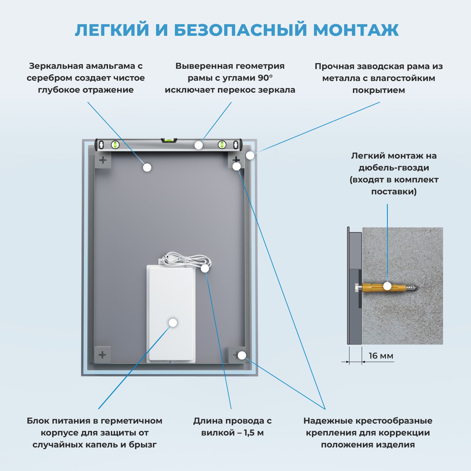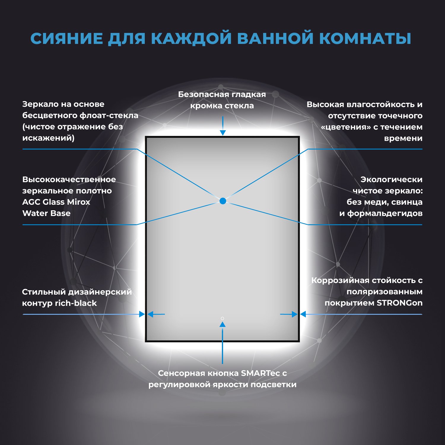 зеркало прямоугольное wellsee 7 rays' spectrum с фоновой led-подсветкой 172200840 50x65 см черный контур