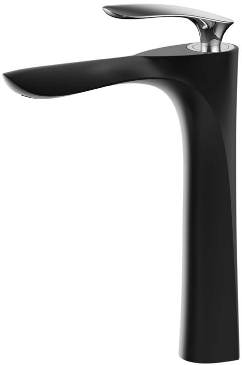 Смеситель для умывальника с высоким изливом, однорычажное управление. Стильный черный матовый цвет с хромированными вставками, ультрамодный смеситель с высоким изливом подойдет для монтажа на столешницу, к умывальнику в виде чаши. Kерамический картридж позволяет плавно и легко регулировать температуру и напор воды.
