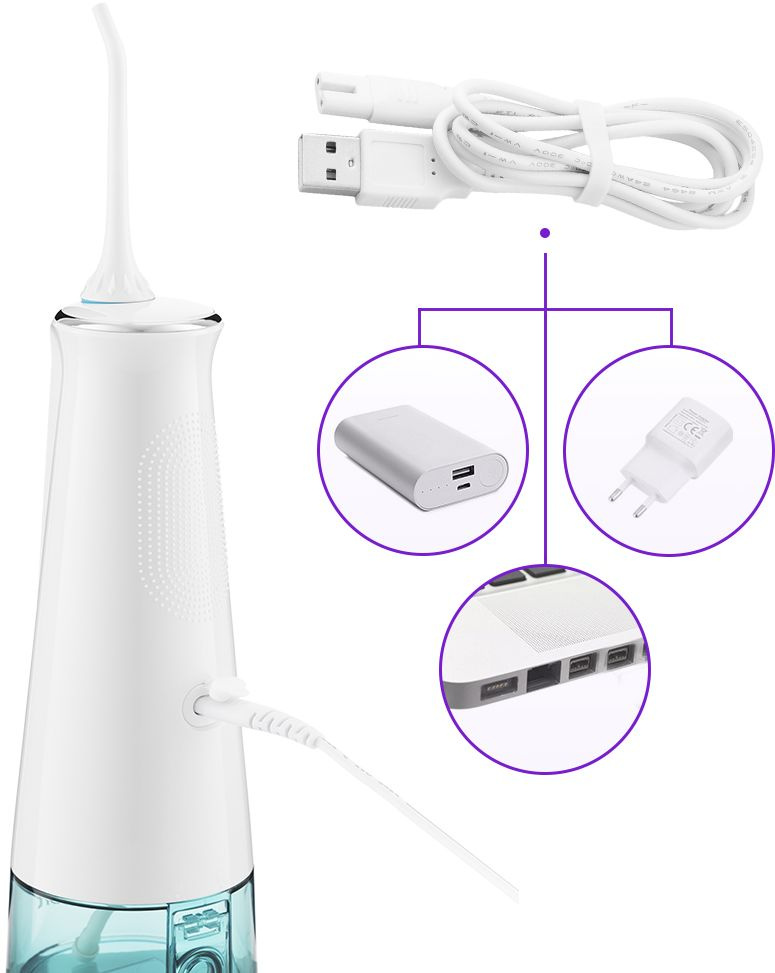 ОписаниеПростой и эффективный прибор для чистки полости рта. Тонкая и сильная струя воды не только вымывает остатки еды, налёт из межзубного пространства и пародонтальных карманов, но и массажирует дёсны. 3 режима работы. Резервуар для воды 230 мл. Заряжать ирригатор можно с помощью USB-шнура.