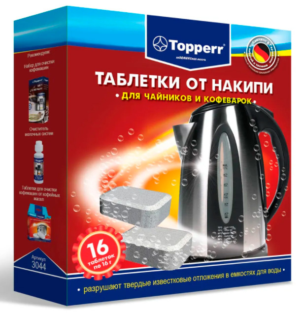 ОписаниеTopperr таблетки от накипи для чайников и кофеварок, 16 шт.*16 г Таблетки TOPPERR для удаления накипи разрушают твердые известковые отложения в емкостях для воды, кофейных аппаратах или чайниках. Регулярное применение увеличивает срок службы приборов.
