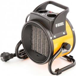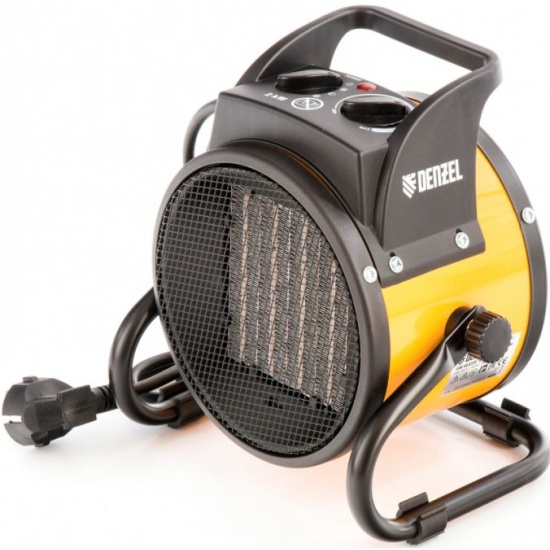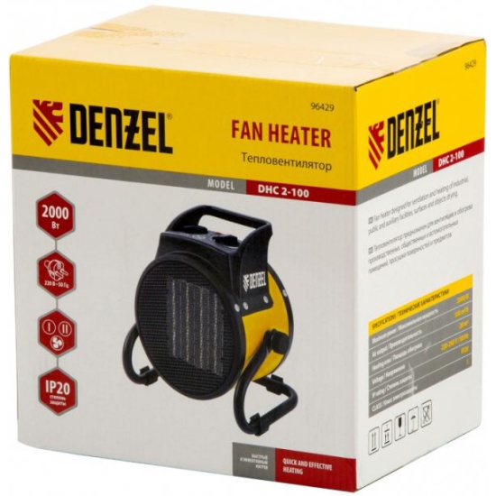 Тепловая пушка Denzel DHC 2-100, 96429Тепловая пушка Denzel DHC 2-100 пригодится в любую погоду: в холод она обогреет помещение, а в жару ее можно использовать как вентилятор. Также она применяется для дистанционной просушки поверхностей во время отделочных работ: окрашенных и оштукатуренных стен, стяжек. Ее мощности 2 кВт хватит для обогрева помещения до 20 м2.Благодаря керамическому нагревательному элементу тепловую пушку можно использовать в помещениях с людьми и животными, т.к. он не сушит воздух и не выделяет вредных веществ.Преимущества:Двойная система защиты: биметаллический многоразовый предохранитель отключает питание при перегреве, а в случае его отказа срабатывает одноразовый термодатчик.Блок управления находится сверху на корпусе - благодаря этому удобно переключать режимы когда тепловентилятор стоит на полу.В зависимости от погодных условий можно выбрать подходящий режим: вентиляция (без нагрева), теплый воздух 1 кВт, горячий воздух 2 кВт.За счет встроенного термостата легко поддерживать постоянную температуру в помещении.Благодаря корпусу с регулировкой уровня наклона можно направлять поток тепла на конкретный участок.Корпус покрыт термостойкой краской, что предотвращает возникновение коррозии.Металлическая решетка на корпусе (спереди и сзади) предотвращает прикосновение к нагревательному элементу.О работоспособности устройства пользователя информирует световой индикатор, который загорается при включении.Удобно хранить и транспортировать - тепловентилятор весит всего 1,9 кг, а на корпусе предусмотрена ручка.Широкая опора с четырьмя ножками для лучшего сцепления с поверхностью обеспечивает устойчивость тепловентилятора.Гарантия 3 года.