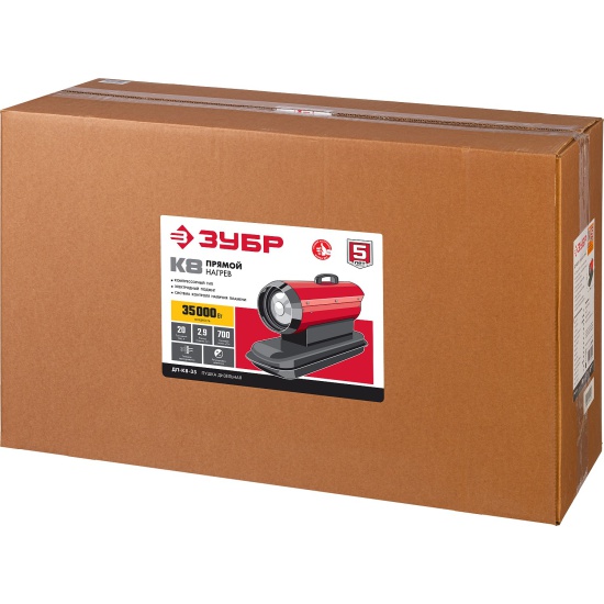 Тепловая пушка дизельная ЗУБР ДП-К8-35, 35 кВт, прямой нагревОписаниеВысокоэффективный дизельный теплогенератор прямого нагрева работающий на дизельном топливе для всех климатических условий. Оптимально подходит для сушки и прогрева на строительных площадках складских комплексов и проветриваемых помещений. Надежный поджиг и эффективное горение гарантируют безотказную подачу тепла в любых условиях эксплуатации. ЗУБР - тепло всегда и вездеПрименениеДля генерации горячего воздуха, который может быть использован для обогрева, сушки промышленных, складских, вспомогательных помещений и т. д.ПреимуществаНадежная и высокопроизводительная пушка для обогрева производственных и складских помещенийВысокий уровень КПД, близкий к 100% за счет прямого нагреваНизкое энергопотребление способствует экономичностиКачественная горелка гарантирует эффективное бесперебойное горение и долгий срок службыДвойной электрод из жаростойкой стали в керамическом изоляторе обеспечивают надежный поджиг горелки при минимальных потерях топлива и не требует очистки и заменыКамера сгорания повышенной толщины из жаропрочной сталиНадежный компрессор с фильтрами очистки воздуха и манометром для визуального контроля правильной работы дизельной пушкиЭлектронный регулятор температуры и возможность подключения внешнего термостата позволяет использовать устройство в автономном режиме, автоматически поддерживая заданную для работы температуруДисплей отображает внешнюю температуру, процесс самотестирования при включении, выдает код ошибки при отказе одной из систем управленияДополнительный защитный кожух в качестве экрана предотвращает повышенный нагрев корпусаСистема контроля пламени с фотодатчиком не даст погаснуть пламени во время работыЗащита от высекания пламени (пушка автоматически пытается зажечь пламя не более 3-х раз)Устойчивая работа при перепадах и скачках напряжения сети до 170ВТеплоотражающий стальной экран в передней торцевой части корпуса задерживает открытое пламя и не даёт ему вырываться наружу, тем самым обеспечивая равномерный нагрев помещения, либо рабочей поверхностиВозможность подключения внешнего термостата обеспечивает полностью автоматическую работу