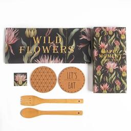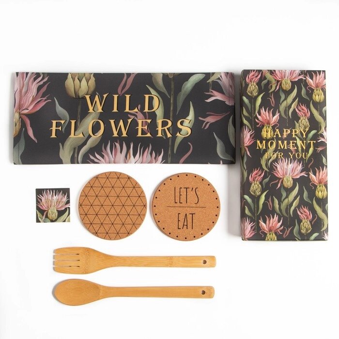 • Составляющие набора Полотенце, Открытка, Подставка под горячее, Кухонная лопатка, Ложка кухонная