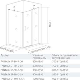 Душевой уголок с распашной наружу и внутрь дверью с подъемным механизмом. Безопасное закаленное стекло толщиной 6 мм. Состоит из душевой двери FANTASY DR-100-С-CH и боковой части FANTASY SP-90-C-CH.