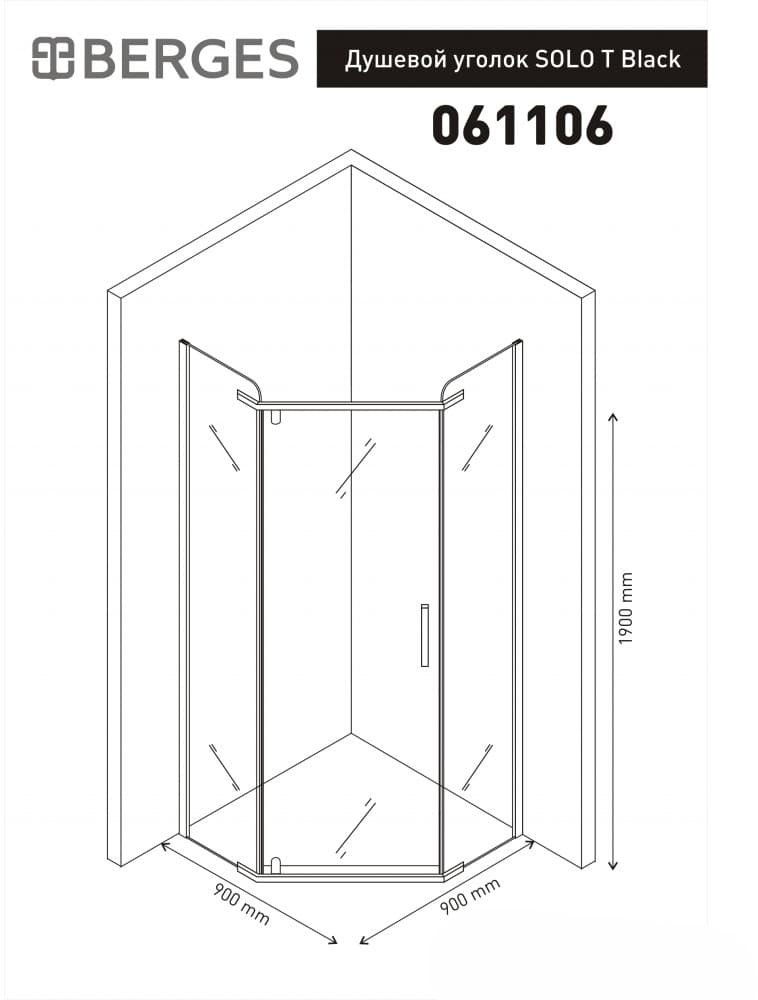 душевой уголок berges solo t black 90x90 стекла прозрачные, профиль черный