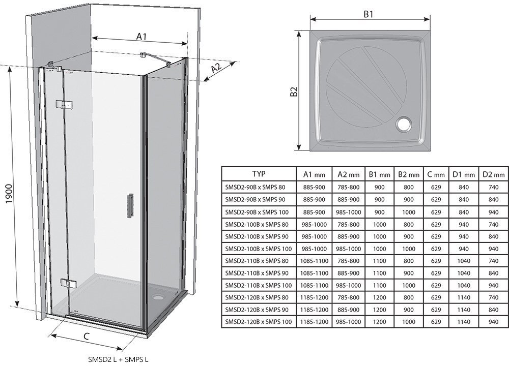 Душевой уголок Ravak SmartLine SMSD2+SMPS 120x90 стекла прозрачные, профиль хром (левый)