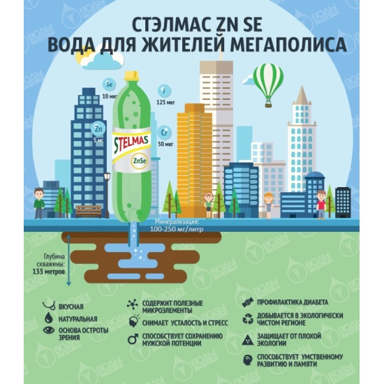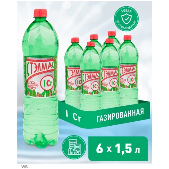 Вода питьевая СТЭЛМАС газированная 1,5 л (6 штук в упаковке)«STELMAS» — ВОДА ПИТЬЕВАЯ ПЕРВОЙ КАТЕГОРИИСостав:Магний (Mg)< 65 мг/л;Кальций (Ca)< 120 мг/л;Селен< 0,01 мг/л;Гидрокарбонаты (HCO)< 300 мг/л;Натрий (Na)< 150 мг/л;Калий (K)< 20 мг/л;Хром< 0,05 мг/л;Сульфаты (SO4)< 200 мг/л;Хлориды (Cl) 75 мг/л;Йод< 0,125 мг/л;Железо< 5 мг/л;Особенности:«STELMAS» — это вода для жителей мегаполисов. В ней содержатся микроэлементы цинк (Zn), селен (Se), йод (I), хром (Cr), которые крайне дефицитны у жителей мегаполисов. Наша пища бедна этими минералами (удобрение, термическая обработка, консервирование, и т.д.). Если Вы будете ежедневно пить 2-2,5 литра воды «STELMAS»,то Вас удивит насколько меньше проблем со здоровьем может быть всего лишь употребляя правильную артезианскую воду.Подробнее:Сегодня, когда на прилавках магазинов большое количество вод, возникает вопрос – какую же воду пить?Предлагаем Вам артезианскую питьевую воду «STELMAS»с дефицитными жизненно необходимымимикроэлементами J, Se, Zn, Cr.Почему?Основные болезни в нашем организме происходят из-за дефицита воды и жизненно необходимых дефицитных макро- и микроэлементов.Так в Москве по исследованиям Центра биотической медицины дефицит химических элементов в рационе женщин в возрасте 25-35 лет составляет: J — йод (55-65%), Se — селен (47-52%), Zn — цинк (39-47%), Сr — хром (18-25%); у детей J — йод (57%), Se — селен (52%), Zn — цинк (44%), Са — кальций (47%). Вот поэтому стали выпускать питьевую воду «Стэлмас», в одном литре которой содержится: Se ~ 10 мкг/л, Zn ~ 5 мг/л, Cr ~ 50 мкг/л, J ~ 125 мкг/л.Возникает законный вопрос, а почему не таблетки или БАДы, в которых так же, и даже разнообразнее представлены эти минералы?Резонный вопрос, и я их принимал до недавнего времени.Но есть и встречный вопрос — как они усваиваются.В воде «Стэлмас» все элементы электрически активны, лучше взаимодействуют и быстрее усваиваются, ведь только водорастворимые вещества усваиваются организмом. Элементы, растворенные в воде легко усвоятся организмом, а их излишки организм легко выведет из организма, через органы выделительной системы, чего не скажешь про таблетки.С водой «Стэлмас», вы постепенно насытите свой организм водой, Zn, Se, Cr, J, избавитесь от проблем, которые возникают при их дефиците.В первую очередь эта вода необходима для больных сахарным диабетом. Из 5 микроэлементов дефицитных при этом заболевании в воде «Стэлмас» содержится 3 – это Zn (цинк), Se (селен), Cr (хром).Селен (Se) – (10 мкг/л) — суточная норма 50 мкг/л.В Финляндии его ввели в рацион питания и за два года количество сердечно-сосудистых заболеваний снизилось в два раза, а болезней эндокринной системы – на 77%, общее количество заболеваний – на 47%. Самая значительная нехватка селена в возрасте 45-55 лет и после 70 лет. Этот феномен, названный профессором А.В.Скальным «селеновой ямой» одна из основных причин повышенной заболеваемости и смертности этих возрастных групп, в том числе от раковых новообразований и сердечно-сосудистых заболеваний.Селен присутствует в ядре клетки. У мужчин 50% селена содержится в яичках и семенных канатиках, т.к. данный микроэлемент связан с половыми гормонами. При достаточном поступлении селен определяет остроту зрения, повышает восприятие света сетчаткой (что очень важно при работе с компьютером), эффективен при заболеваниях поджелудочной железы и инфаркте миокарда, поддерживает эластичность кожи, ускоряет заживление ран, помогает
