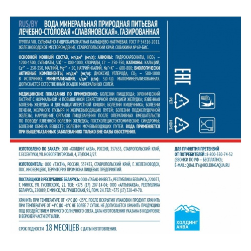 Минеральная вода Славяновская 0,5 л ПЭТ (12 штук в упаковке)Славяновская - это лечебно-столовая газированная вода, добывающаяся из термального источника, расположенного на глубине 260 метров в Железноводске (Ставропольский край). Вода разливается в бутылки непосредственно рядом с источником, что гарантирует сохранение всех полезных минеральных вещества. Славяновская давно известна своими лечебными свойствами и благотворным влиянием на ЖКТ - как при борьбе с заболеваниями, так и их профилактикой. Мягкая лечебно-столовая вода с широким спектром позитивного воздействия на организм. Подходит для частого употребления.Способствует нормализации работы органов пищеварения, помогает при заболеваниях органов дыхания, помогает при урологических и гинекологических проблемах. Применяется в педиатрии для профилактики заболеваний ЖКТ у детей и подростков. Содержит необходимые человеческому организму микро и макроэлементы: Кальций Натрий Магний Калий Гидрокарбонаты Сульфаты и т.д. Регулярный прием после еды полностью устраняет изжогу, горечь во рту и вздутие кишечника. ГОСТ Р 54316-2011Тип воды: лечебно-столоваяПотребление ежедневноеМинерализация Низкая 3—4 г/лГидрокарбонат HCO3- 1200—1500Сульфат SO42- 800–1000Хлориды Cl- 250—350Кальций Ca2+ 250—350Магний Mg2+ < 50Натрий + Калий K++Na+ 600—800Борная кислота H3BO3Углекислота 500—1002
